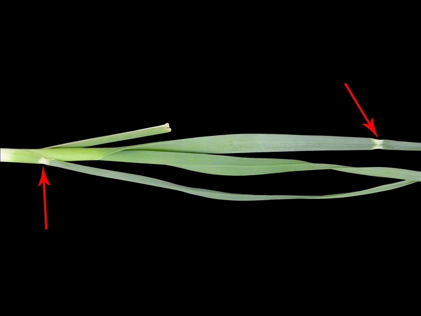 Feuille : présence d’un jaunissement à blanchiment souvent dans la partie distale du limbe. Parfois présence d’une constriction sur le limbe.