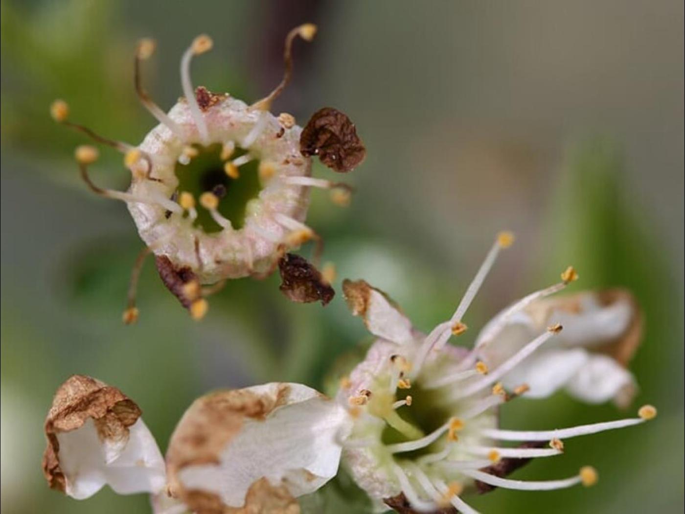 Description: Pistils nécrosés sur des fleurs de cerisier nain rustique ayant subi un gel printanier.