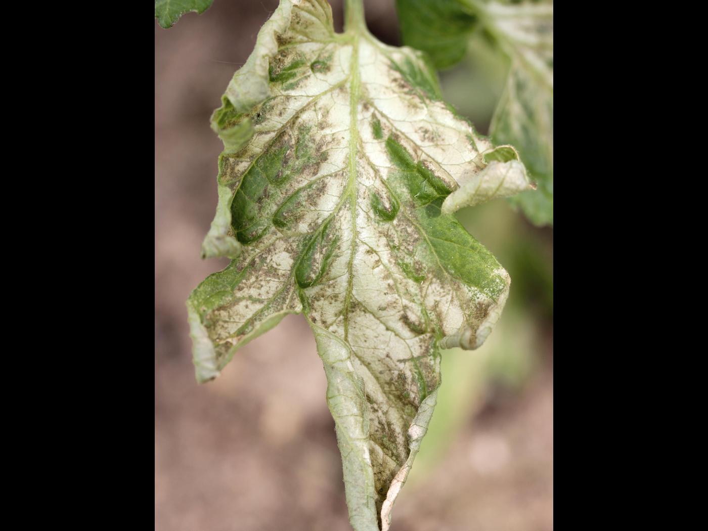 Feuille : les feuilles deviennent rapidement translucides puis noircissent. Présence de brûlures brunes à noires, souvent à la marge. Dessèchement des tissus affectés. Les feuilles peuvent montrer des malformations.