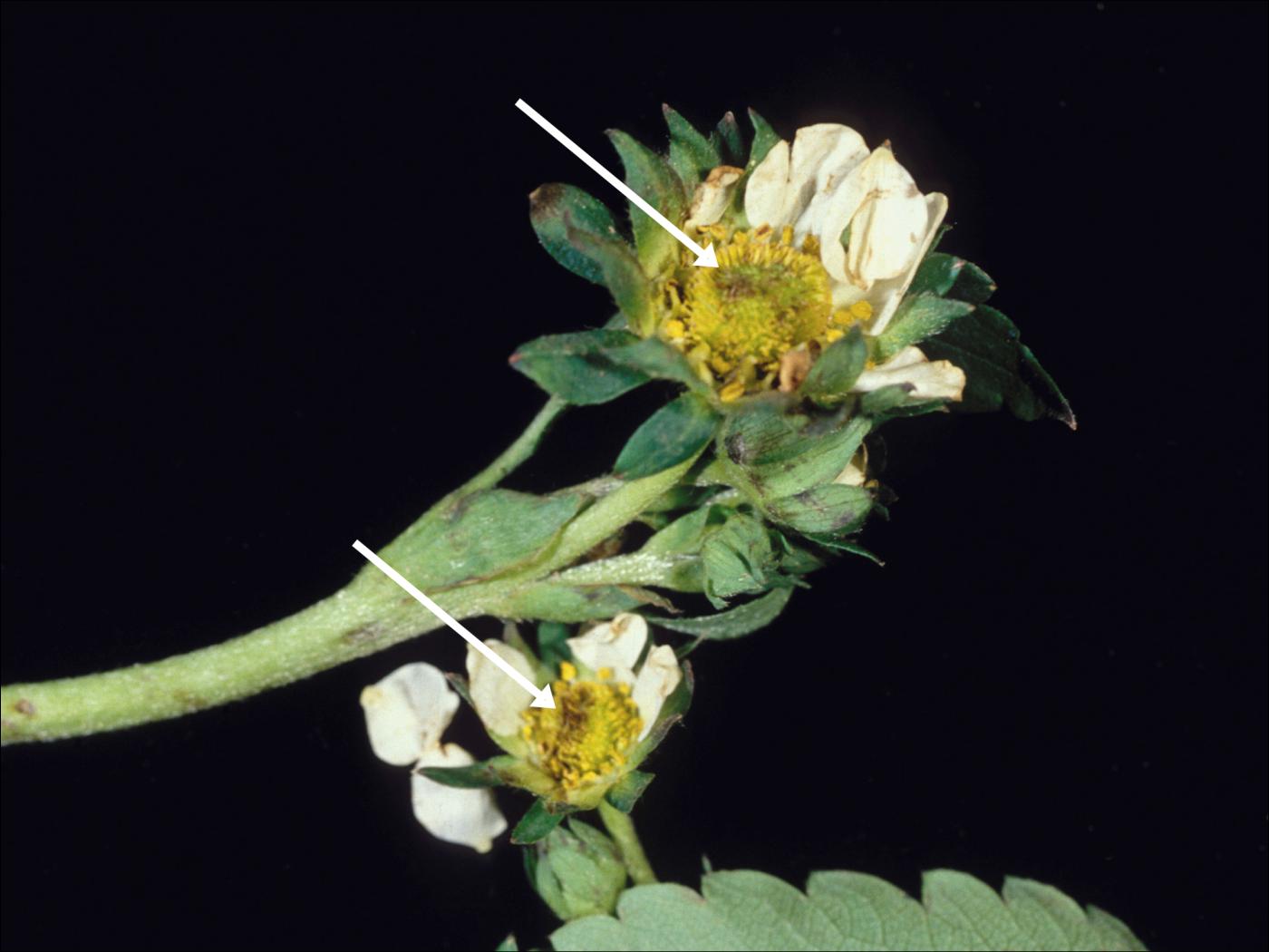 Chez le fraisier, les dommages sur les fruits peuvent être confondus avec ceux de l’anthracnose (Colletotrichum acutatum - sporulation saumon à orange) ou la moisissure grise (Botrytis cinerea – sporulation grisâtre).