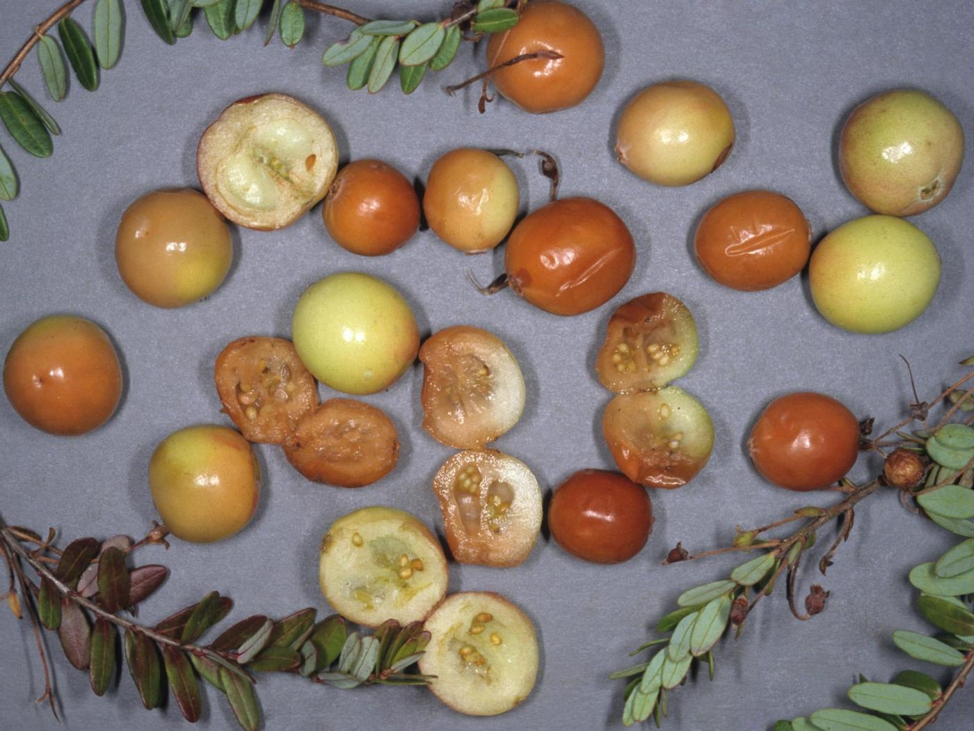 Chez la canneberge, les symptômes externes des fruits peuvent être confondus avec ceux causés par la pourriture des fruits (Coleophoma empetri – fruit entier affecté).