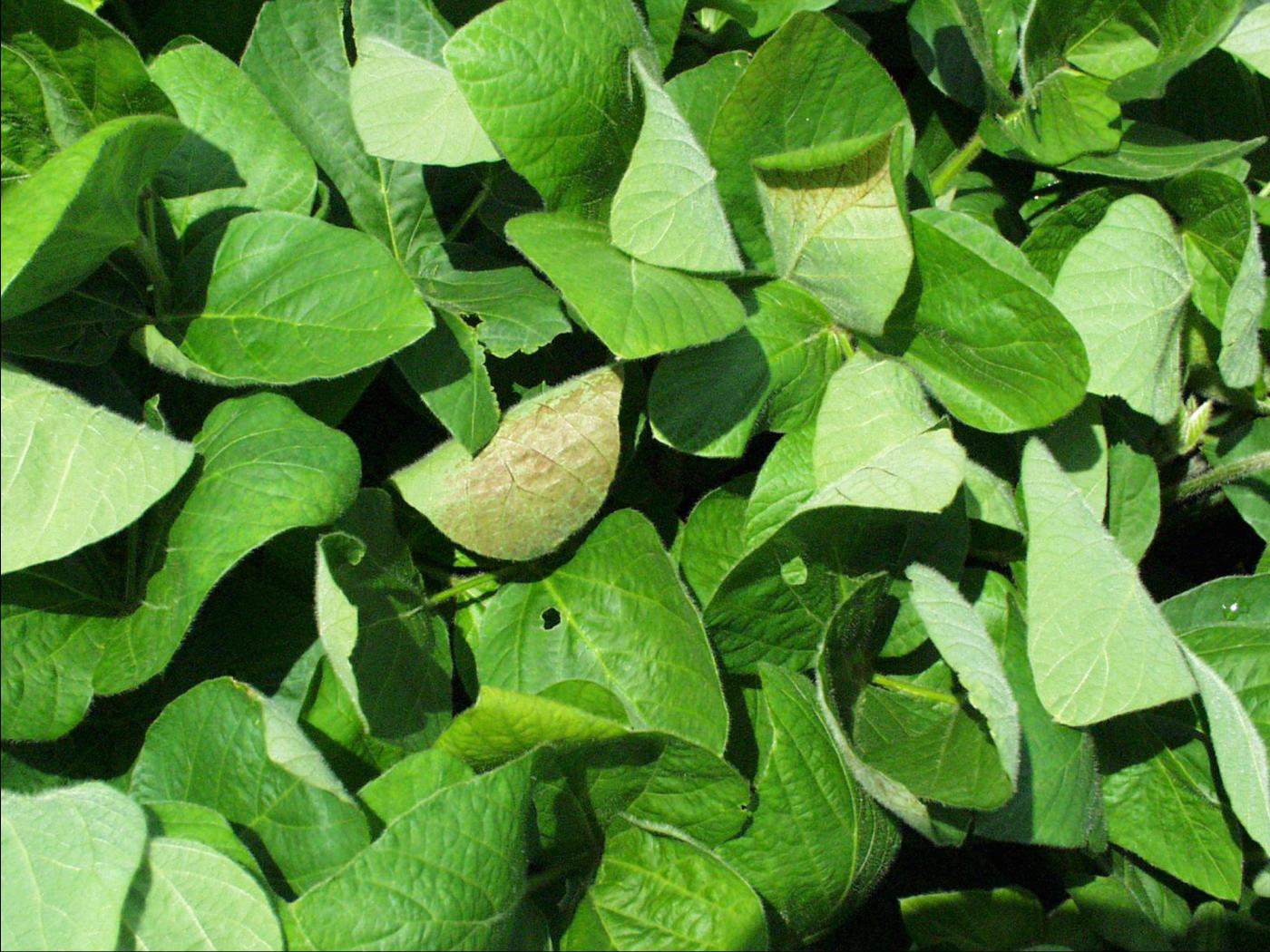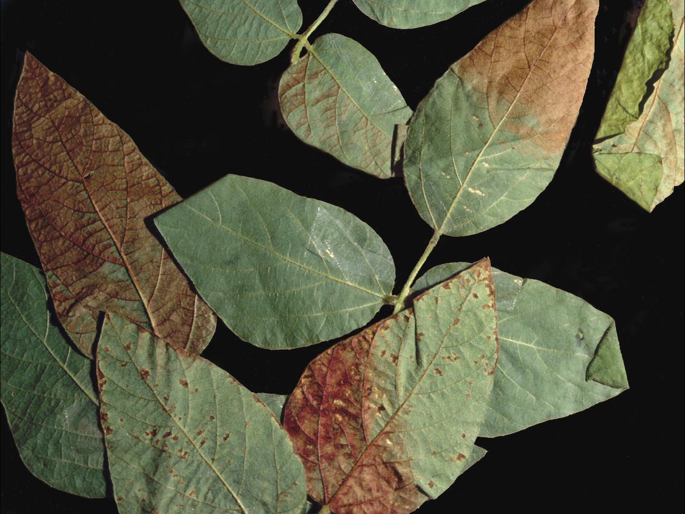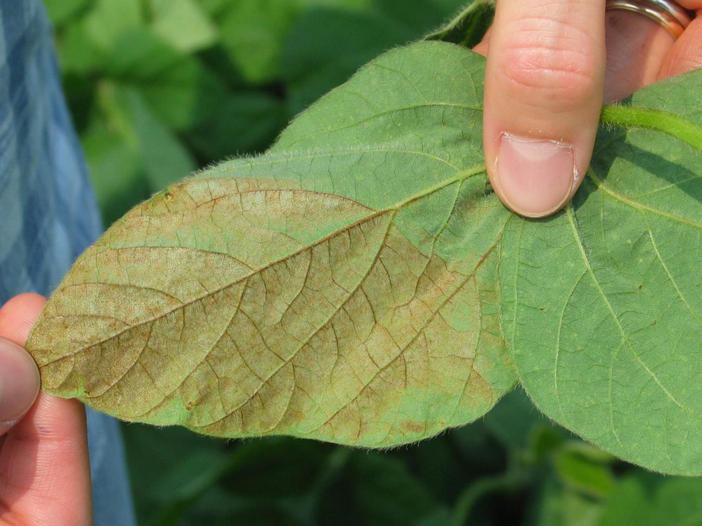 Sur les feuilles de soya, l’insolation peut être confondue avec l’ozone (bronzage des feuilles) et sur la tige, avec des infections bactériennes.