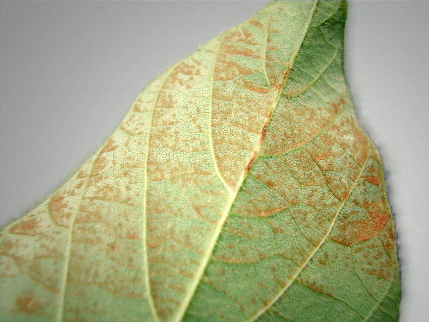 Feuille : présence de petites taches rougeâtres à rouille entre les nervures à la face supérieure et inférieure. À la face inférieure, présence d’un brunissement entre les nervures. Présence d’une délimitation nette entre les tissus sains et affectés. Sur les pétioles, les dommages apparaissent comme des lésions allongées rougeâtres à rouille.