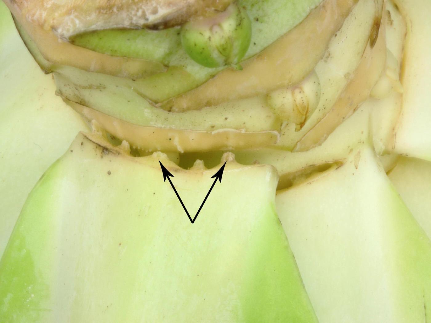 Feuille : au début, présence de minuscules protubérances ou boursouflures, de 1 à 2 mm de diamètre, à la face inférieure de la feuille et parfois à la face supérieure. En vieillissant, les protubérances se regroupent et prennent un aspect liégeux lorsqu’elles se brisent. La surface exposée prend alors différentes teintes (rouille, beige à brun). Les protubérances se trouvent surtout le long des nervures ou à la marge.