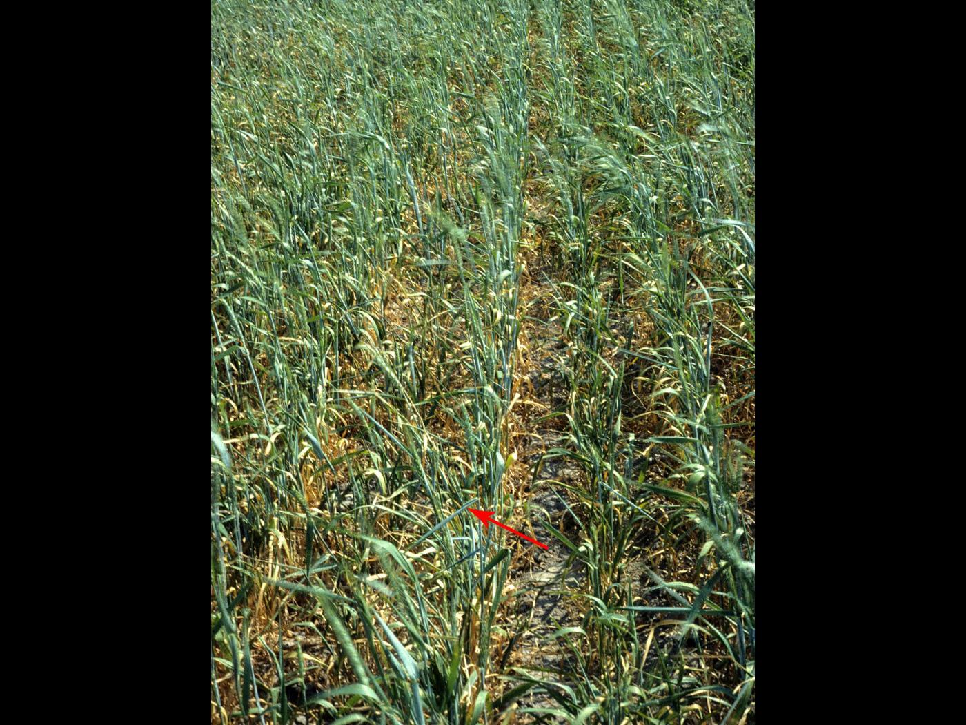 Description: Dans un champ de blé de printemps, les feuilles basales sont jaunies et desséchées tandis que les feuilles médianes et terminales sont flétries et parfois enroulées (voir flèche). Ces symptômes sont causés par le manque d’eau dans le sol occasionné par une très grande sécheresse.