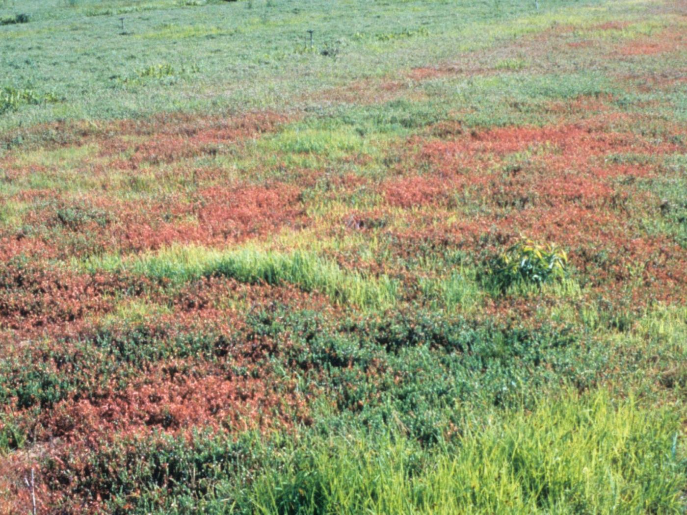 Légende: Zones de plants de canneberge avec un feuillage rouge