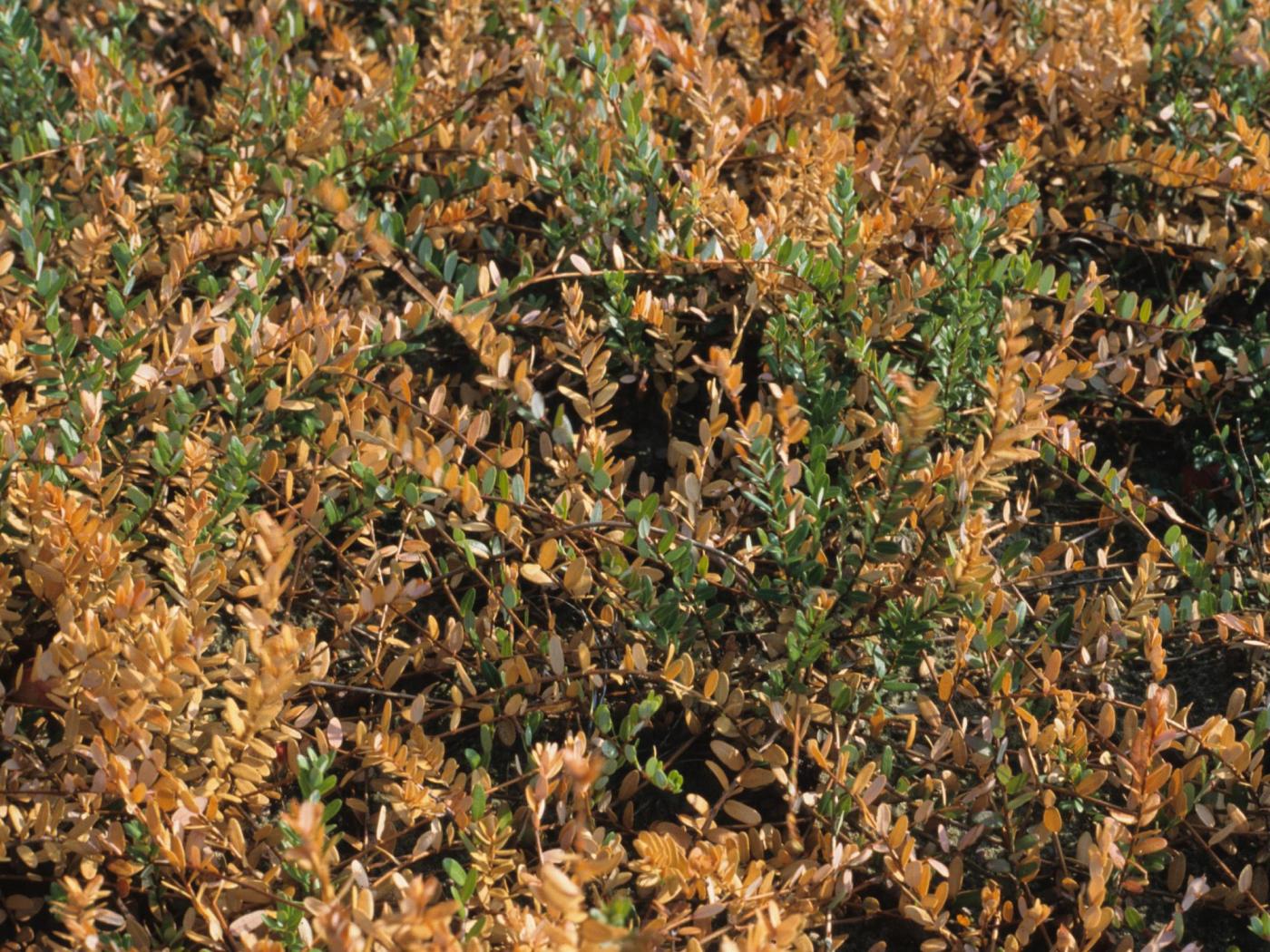 Description: Des plants de canneberge montrent un dépérissement des tiges et des feuilles qui ont pris une teinte brune à orange. Les tiges feuillées verticales sont les plus affectées. Ces plants ont souffert d’un manque d’eau à la suite d’une sécheresse survenue en septembre.