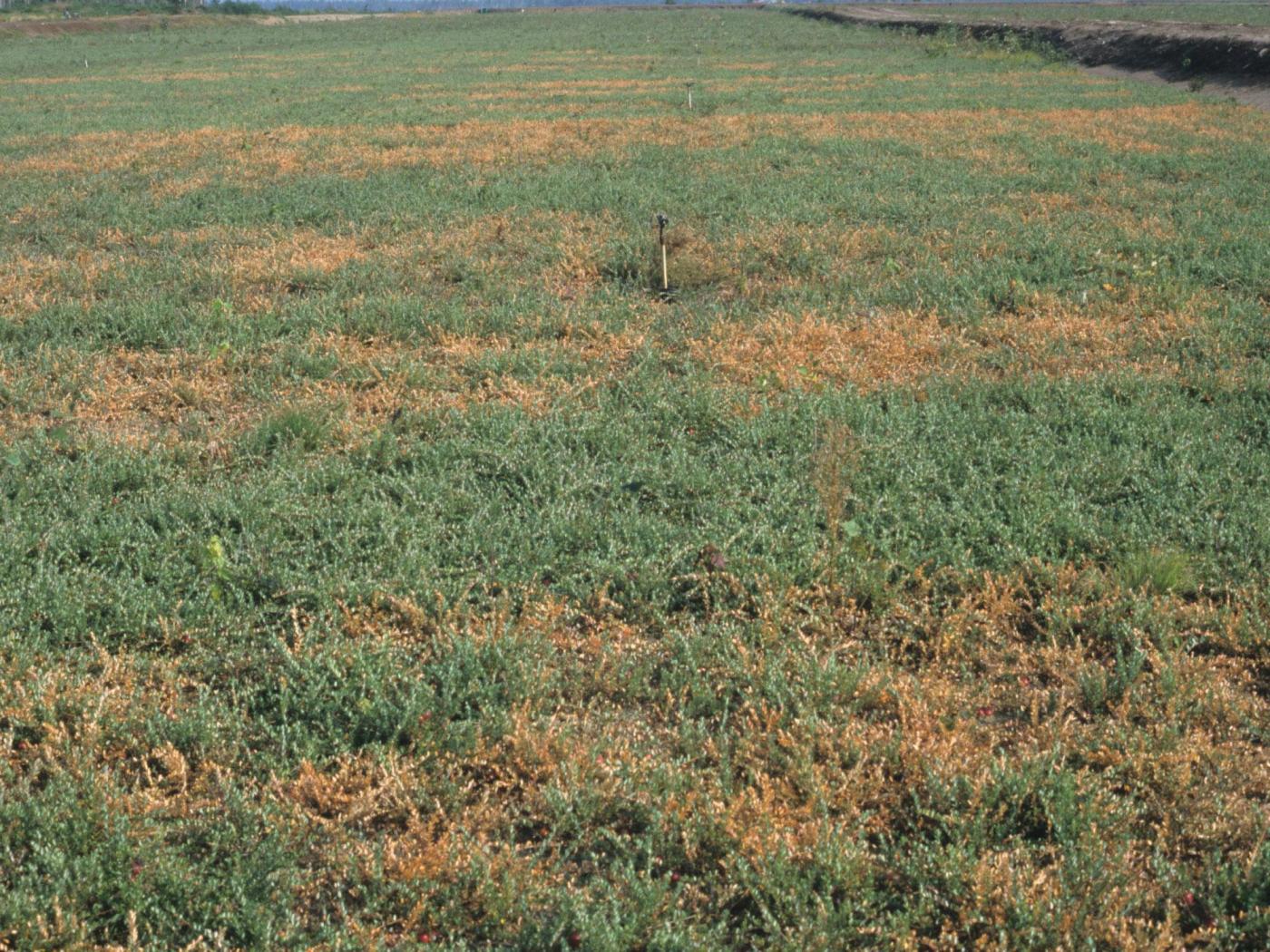 Description: Dans cette cannebergière, une partie du champ montre un dépérissement des tiges et des feuilles qui ont pris une teinte brune à orange. Les tiges feuillées verticales sont les plus affectées. Ces plants ont souffert d’un manque d’eau à la suite d’une sécheresse survenue en septembre.