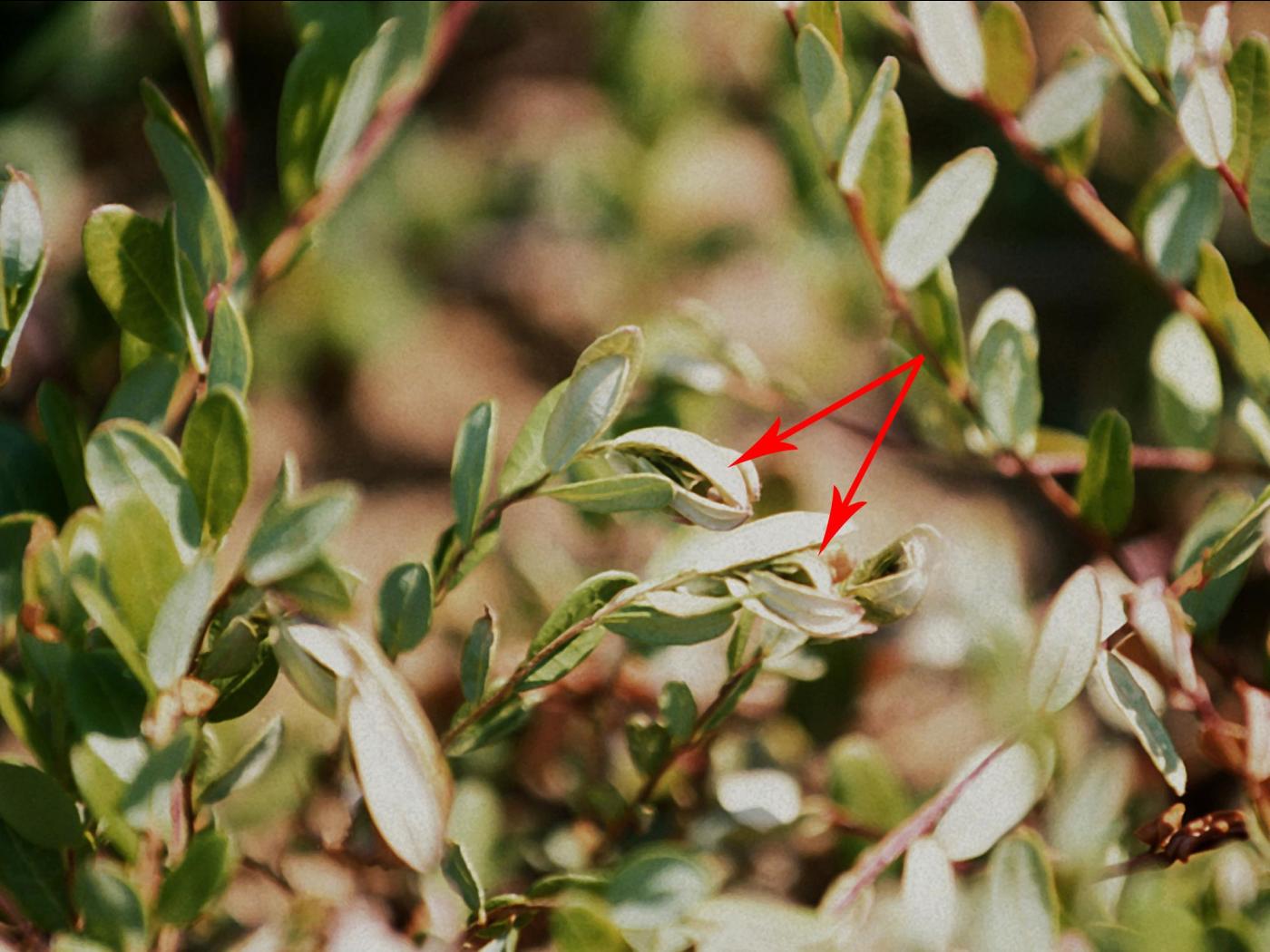Description: Sur des plants de canneberges, les feuilles terminales couvrent le bourgeon en formant une coupe autour de lui (voir flèches). Le flétrissement de l'apex des plants est apparu à la suite d'un manque d'eau causé par une sécheresse survenue en juin.