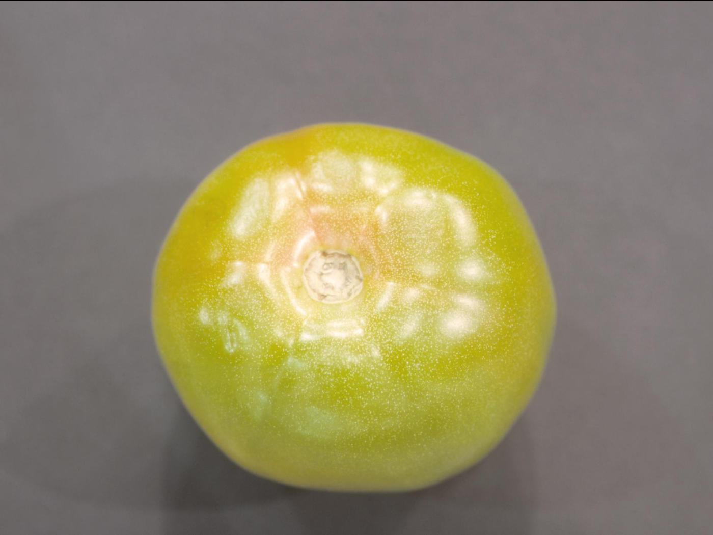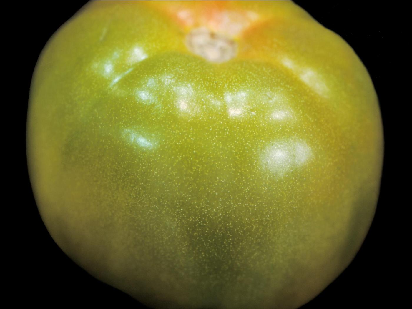 Description: Une tomate commençant à mûrir montre dans la zone pédonculaire et à l’épaule du fruit, la présence d’une multitude de petites taches blanches. Chez la tomate, ce symptôme est caractéristique de la moucheture dorée, causée par un excès de calcium dans le fruit.