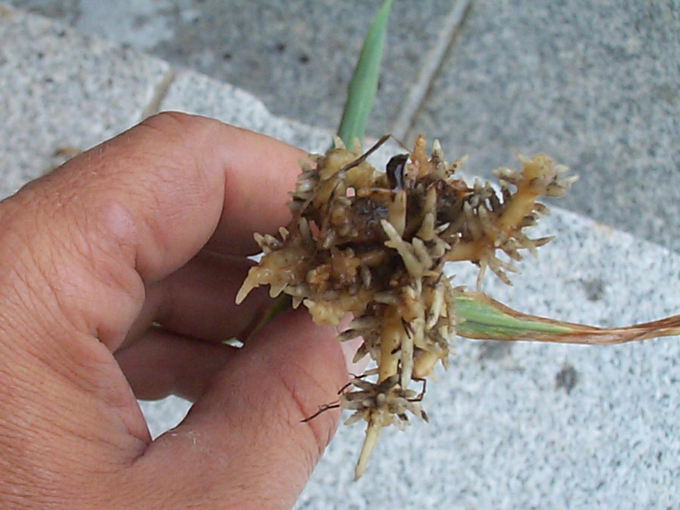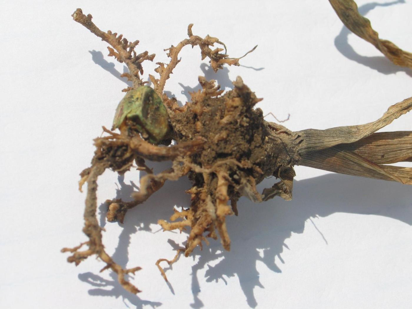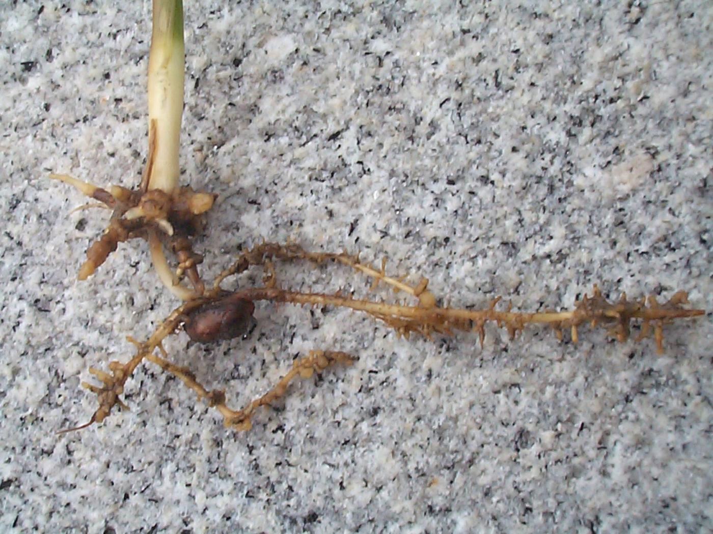Racine : inhibition de l'élongation des racines engendrant le développement d'un système racinaire court, rabougri, cassant et ayant l'aspect d'un buisson. Les racines sont parfois jaunes à brunes.