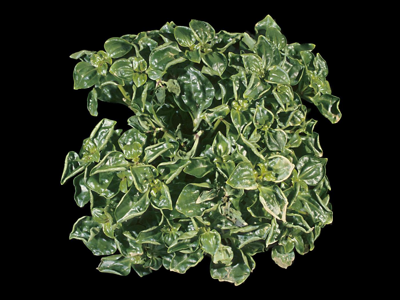 Description: Les jeunes feuilles d’un plant d’exacum ont la marge enroulée vers le haut. Les feuilles médianes et basales sont légèrement gaufrées. Les tests de laboratoire ont révélé un pH élevé du substrat (7,0). L’exacum exige un pH se situant entre 5,4 et 5,8. Il ne devrait jamais excéder 6,0. Les symptômes sont causés par le pH neutre du substrat.
