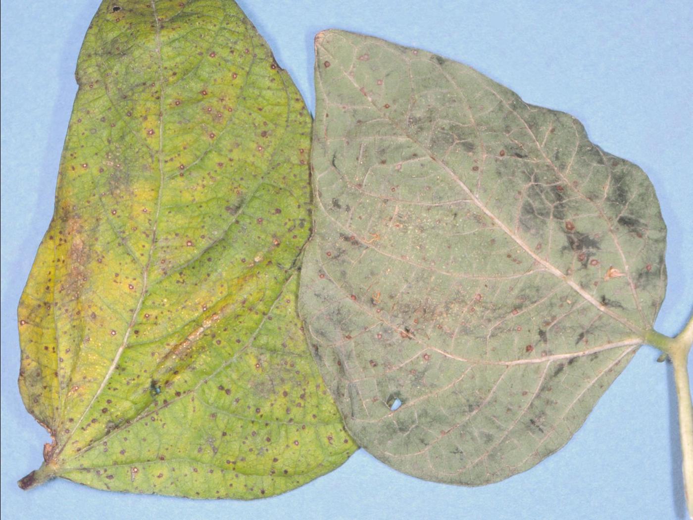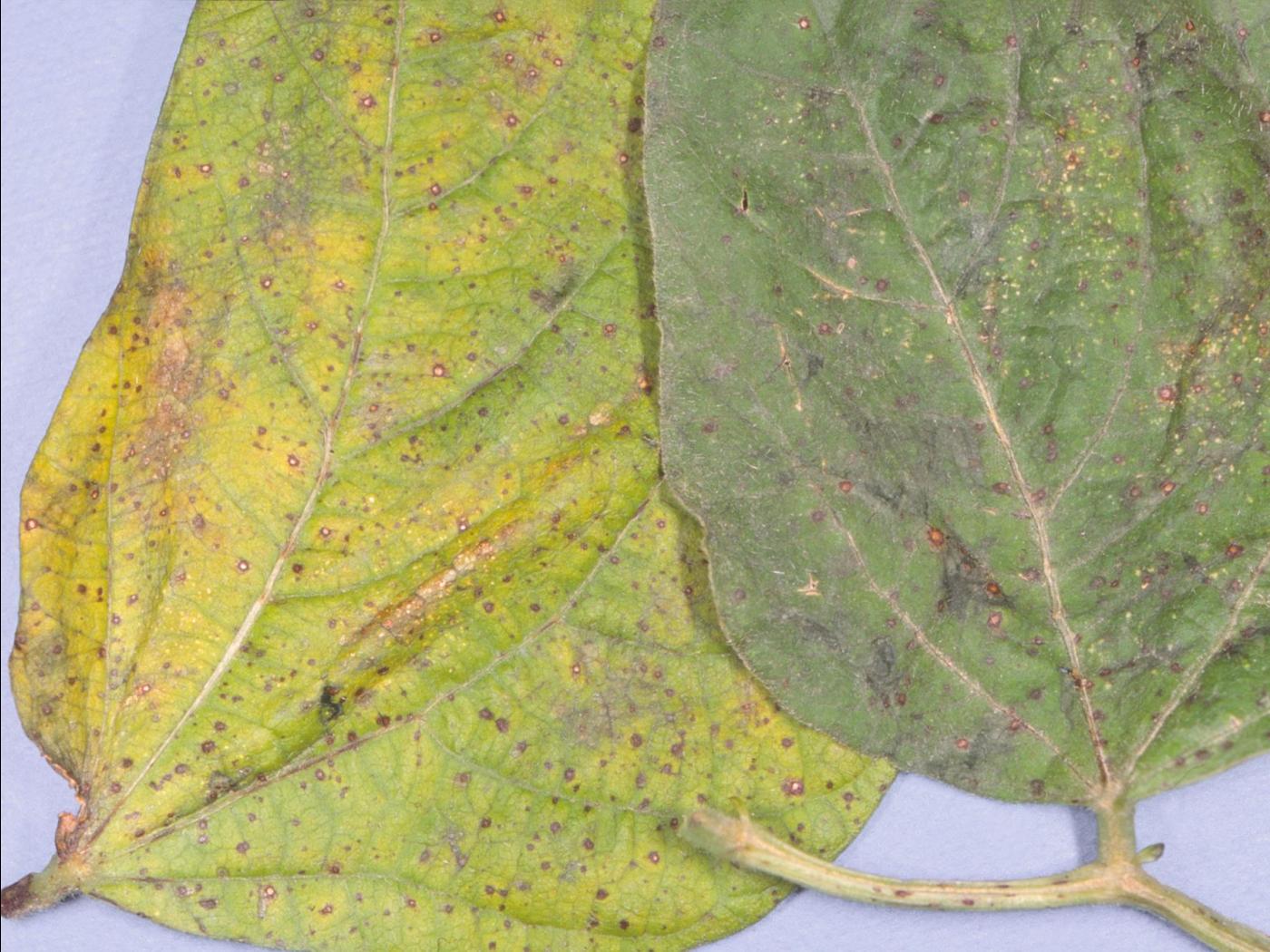 Feuille : présence de taches blanches à jaunes à brunes, circulaires à irrégulières, d’un diamètre variant entre 1 et 5 mm. Les dommages sont visibles sur un seul côté de la feuille.