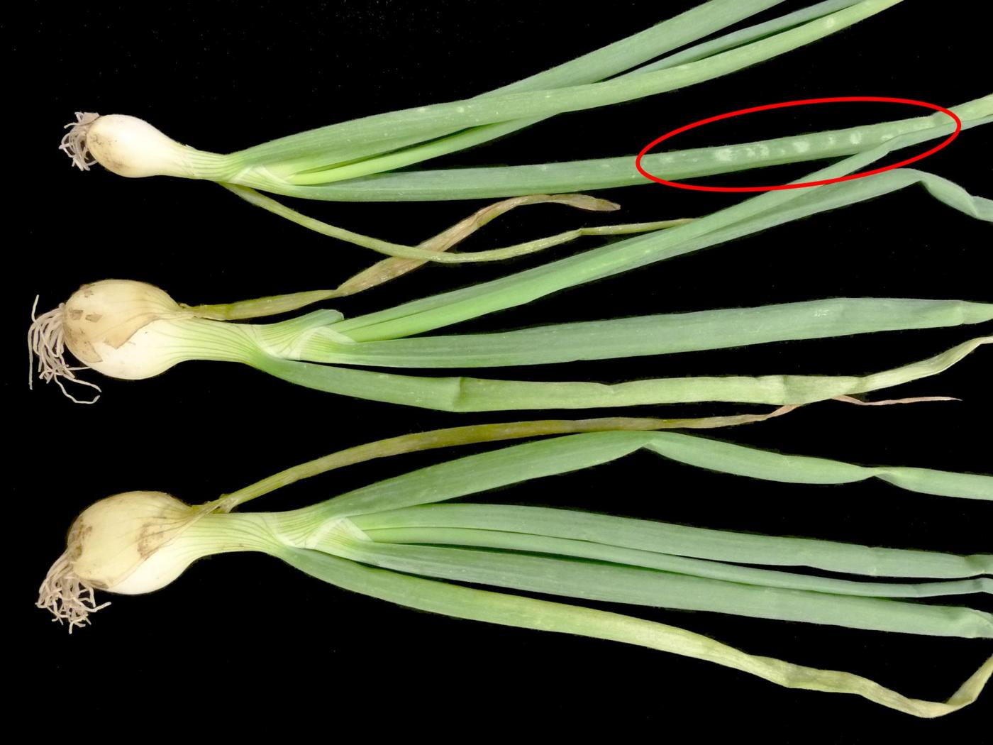 Chez les Allium, ces symptômes peuvent être confondus avec ceux de la brûlure de la feuille (Botrytis sp. – présence de taches jaunes débutant à l’apex et progressant sur la feuille) et le virus des taches jaunes de l’iris (IYSV – taches ovales beiges d’aspect sec mais réparties aléatoirement sur le limbe).