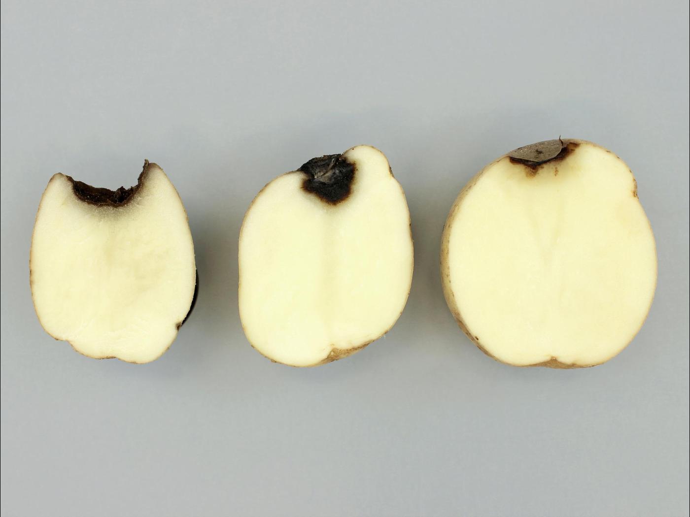 Tubercule : le talon est ratatiné et s’effondre en une masse brun pâle à brune. Brunissement à noircissement de la chair près du talon qui devient vitreuse et gélatineuse puis se rabougrit et sèche. Présence d’une démarcation nette entre les tissus sains et affectés dans la chair. Le brunissement pénètre généralement moins de cinq centimètres (2 pouces) dans la chair.