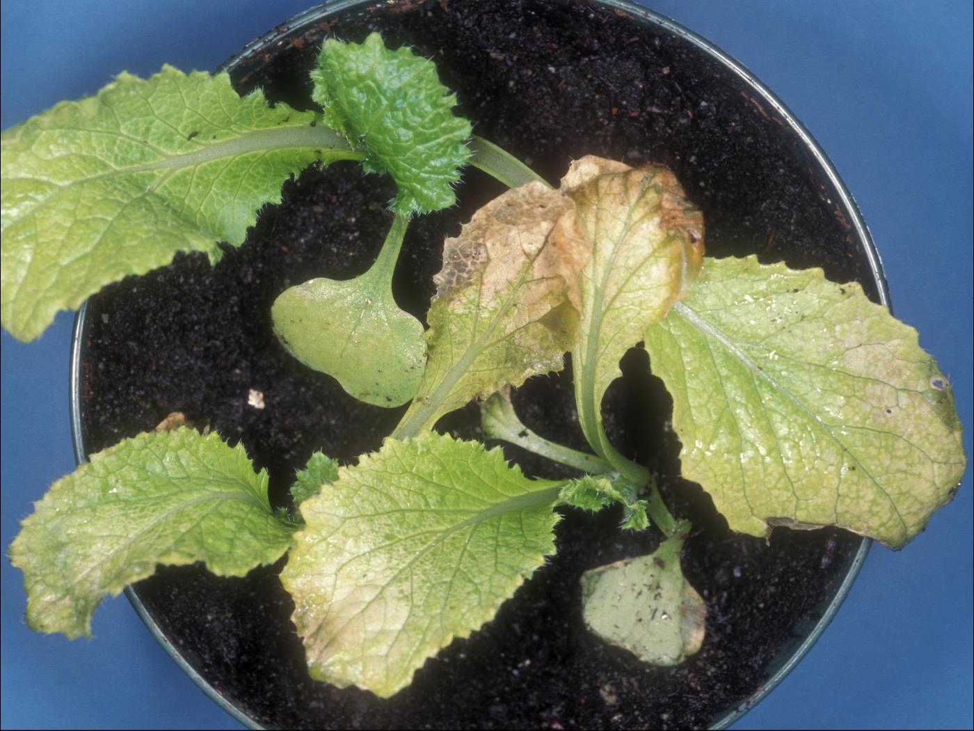 Plantule : présence d’une coloration grisâtre à blanchâtre du limbe des feuilles déployées ou non. Parfois présence d’une brûlure marginale. Dessèchement et mort des tissus affectés.
