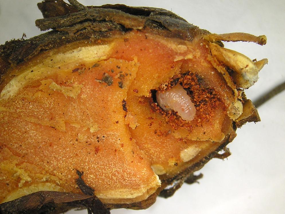 Légende: Coupe transversale du collet d'un plant de fraisiers avec une larve de charançon noir de la vigne dans sa galerie.