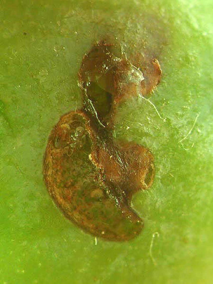 Gros plan sur un bleuet vert présentant une cicatrice de ponte du charançon de la prune : la cicatrice se caractérise par sa forme de croissant. Cette cicatrice est causée par le comportement de la femelle qui perce une ouverture de forme particulière avant de déposer ses oeufs directement dans la chair du fruit.
