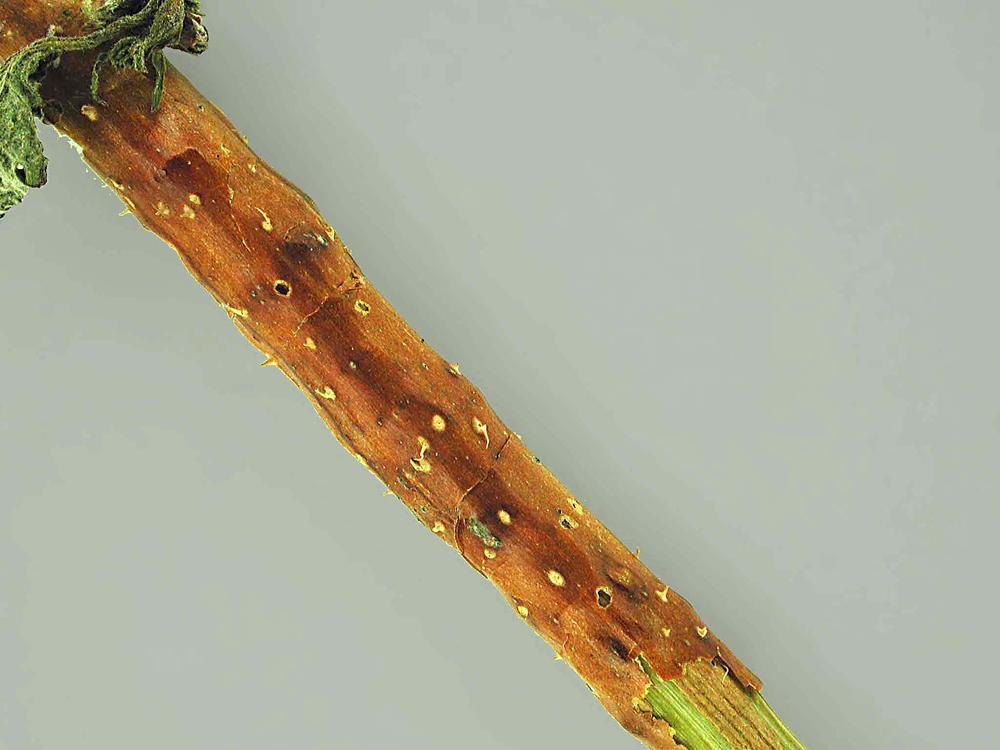 Description: Canne fructifère de framboisier présentant des dommages causés par la larve de l'agrile du framboisier. Ce symptôme est occasionné lors de la première année de croissance de la canne. La jeune larve creuse un tunnel en spirale autour de la tige au niveau du cambium. À un stade plus avancé, elle s'enfonce dans la moelle en minant une galerie en zigzag. Les plants attaqués présentent des renflements et l'écorce est fendillée. Les tiges se dessèchent de haut en bas et les tiges minées cassent facilement sous l'effet du vent ou de la neige. Un renflement allongé de la tige correspond au site d'hibernation de la larve âgée.