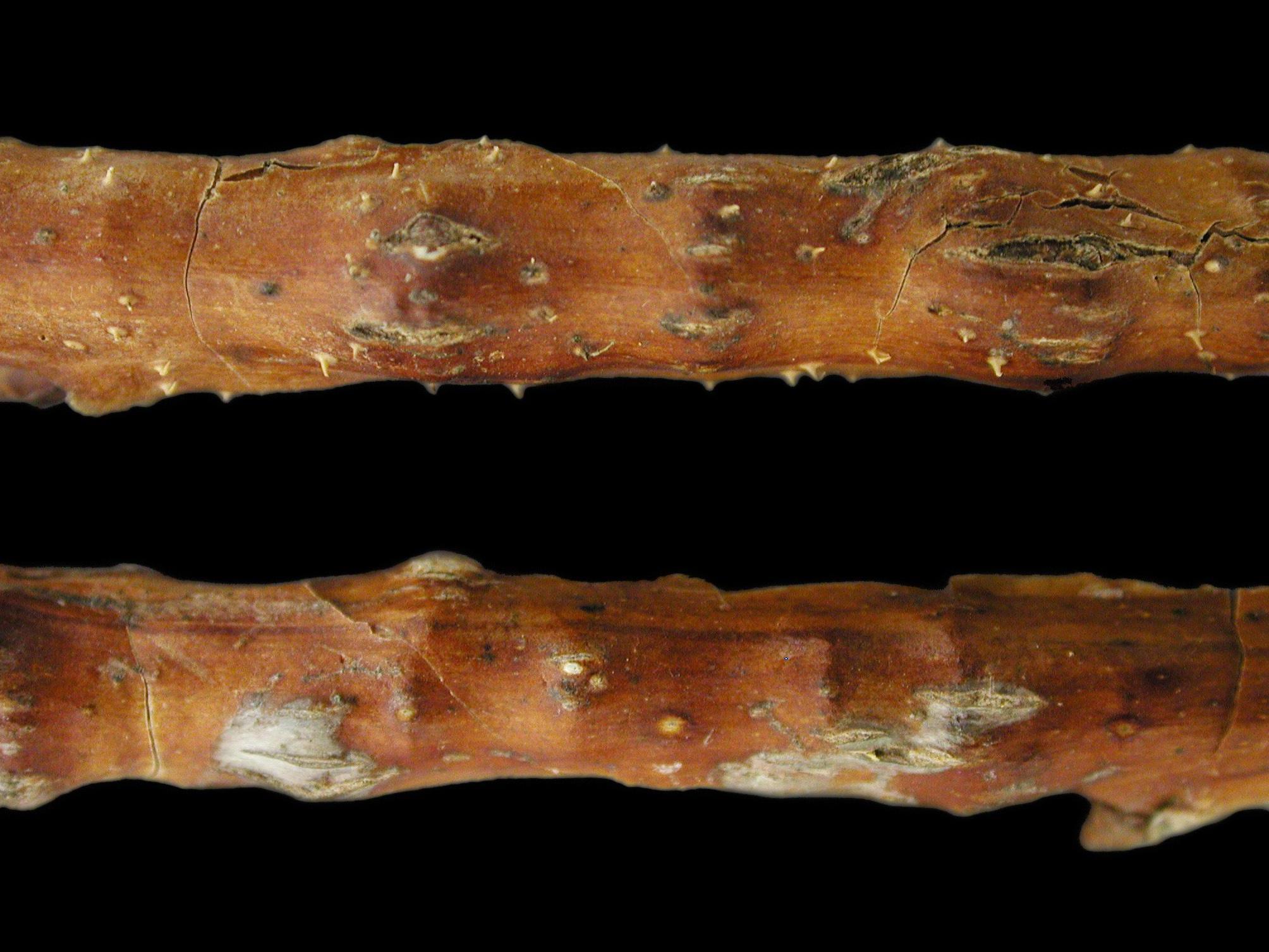 Description: Canne fructifère de framboisier présentant des déformations et des fentes. Ce symptôme est occasionné lors de la première année de croissance de la canne. La jeune larve creuse un tunnel en spirale autour de la tige au niveau du cambium. À un stade plus avancé, elle s'enfonce dans la moelle en minant une galerie en zigzag. Les plants attaqués présentent des renflements et l'écorce est fendillée. Les tiges se dessèchent de haut en bas et les tiges minées cassent facilement sous l'effet du vent ou de la neige. Un renflement allongé de la tige correspond au site d'hibernation de la larve âgée.