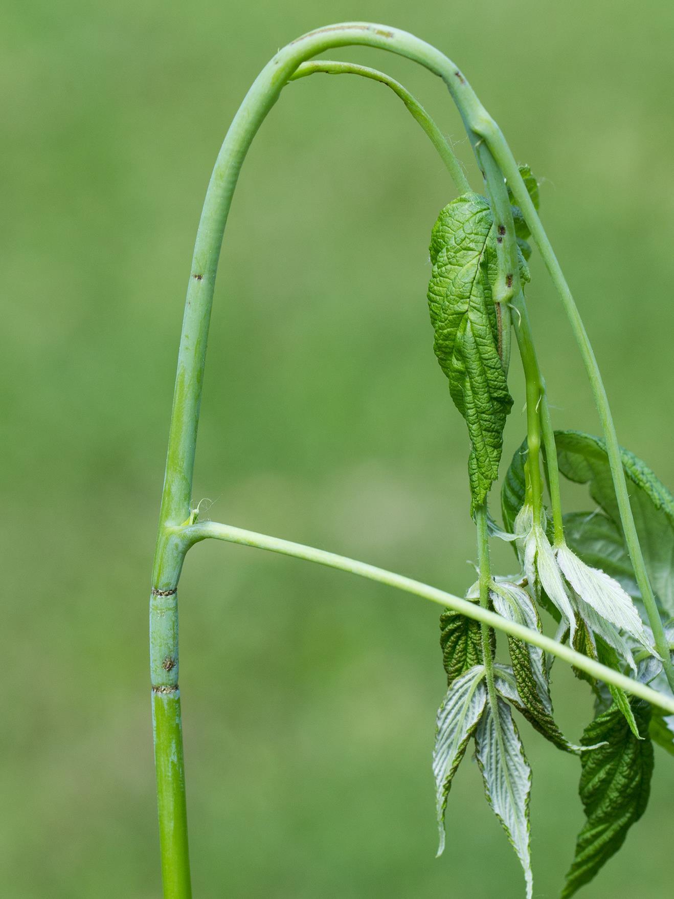 Description: Apex d'un plant de framboisier portant deux cicatrices distancées et entourant la tige (en forme d'anneaux). La femelle grignote la tige pour former deux anneaux et dépose ensuite un oeuf entre les cicatrices. La partie située au-dessus des cicatrices flétrit et tombe.