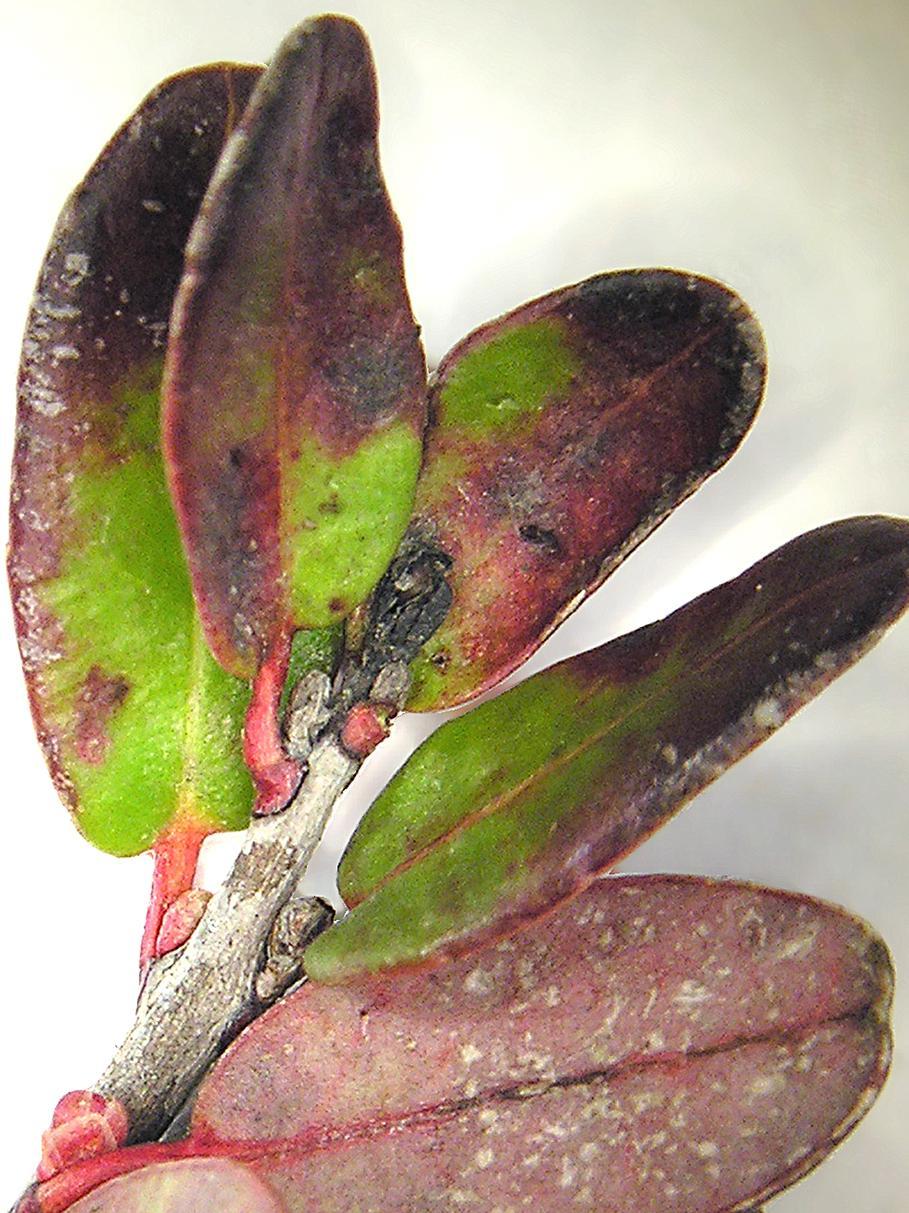 Description: Apex d'une nouvelle pousse de canneberge sur laquelle on observe le dommage d'alimentation d'une larve de la cécidomyie des atocas. Les larves brisent le point de croissance de la tige ce qui entraîne l'avortement du bourgeon terminal, forçant la plante à produire des tiges latérales. Les feuilles endommagées se courbent, forment une coupe, se décolorent, brunissent et tombent.