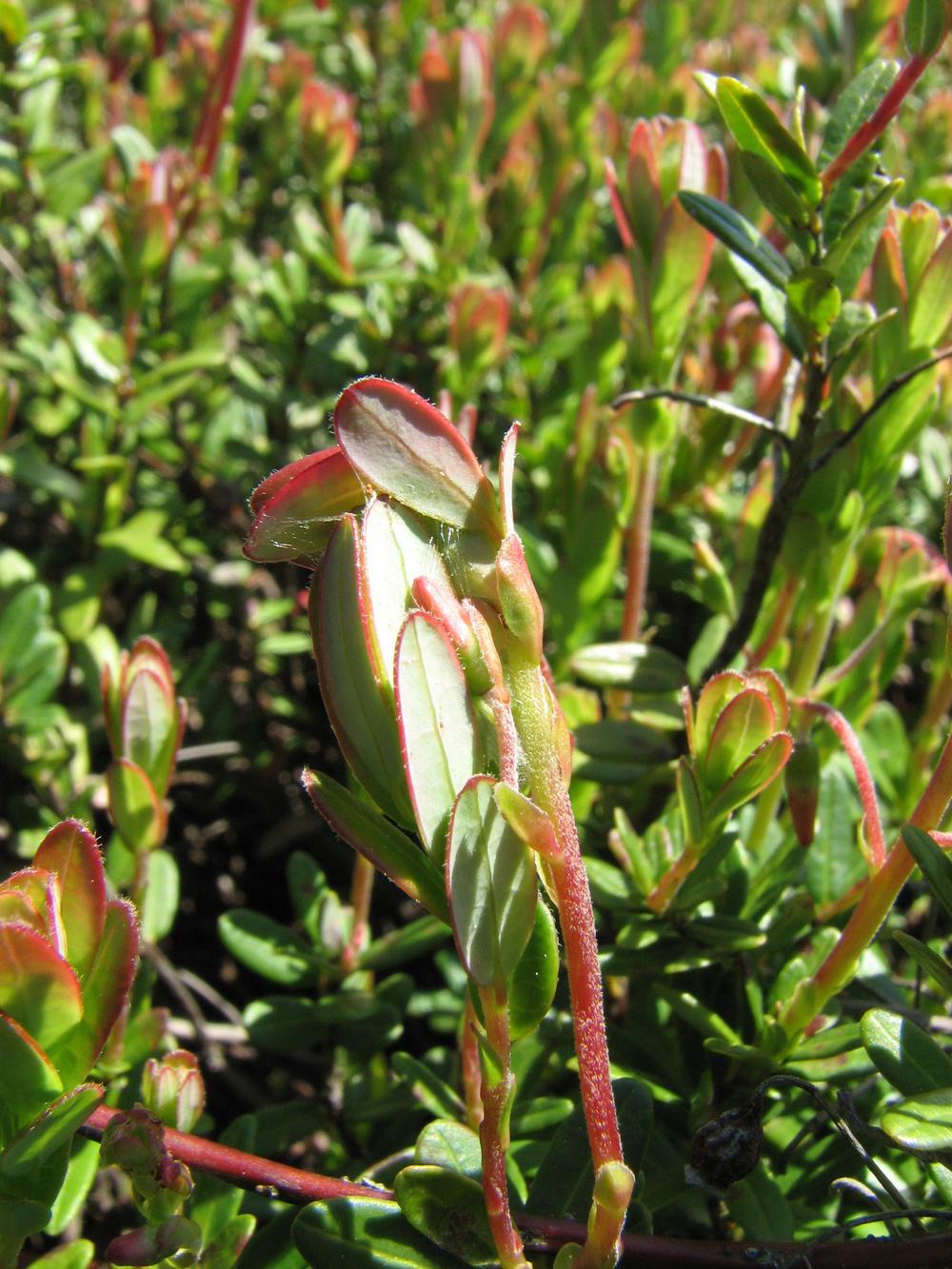 Description: Tiges de canneberge présentant des dommages causés par des larves de la tordeuse de la vigne. On observe que les feuilles terminales de ces nouvelles tiges sont enroulées par des toiles tissées. Ce dégât est visible au printemps et est causé par les larves de la première génération. Les zones sévèrement infestées deviennent brunâtres en raison du grignotement des chenilles qui ne laissent que les nervures principales des feuilles. Les chenilles de la deuxième génération se nourrissent des feuilles, des fleurs ainsi que des fruits.