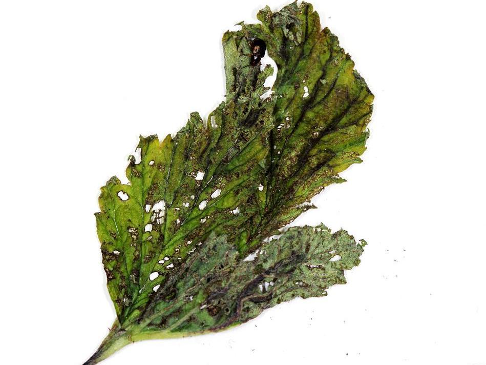 Légende: Feuille endommagée par la chrysomèle du fraisier