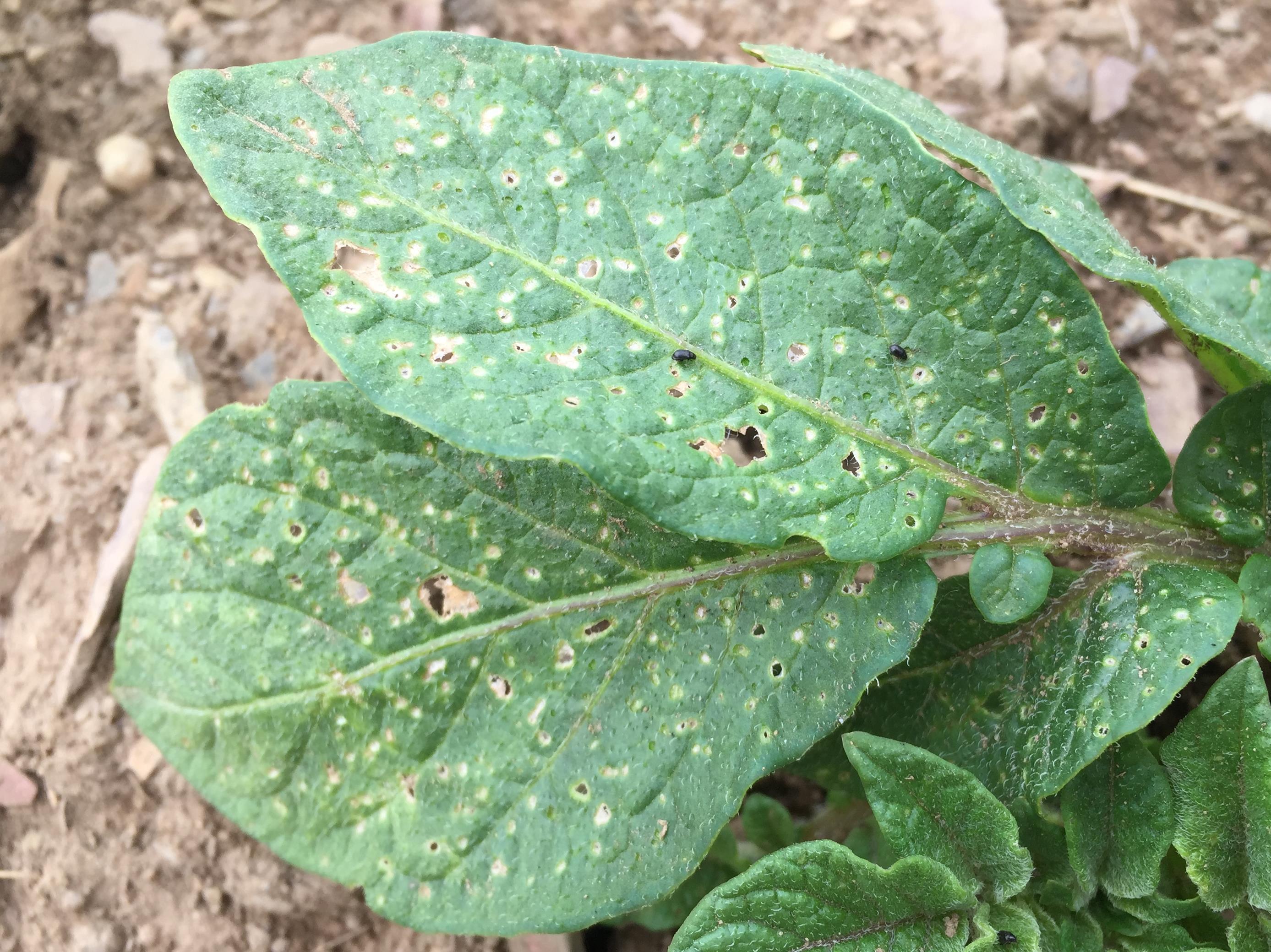 Description: Feuillage d'un plant de pomme de terre présentant des dommages causés par l'altise de la pomme de terre. Ces dommages se présentent sous la forme d'une multitude de petits trous arrondis dans le limbe des feuilles.