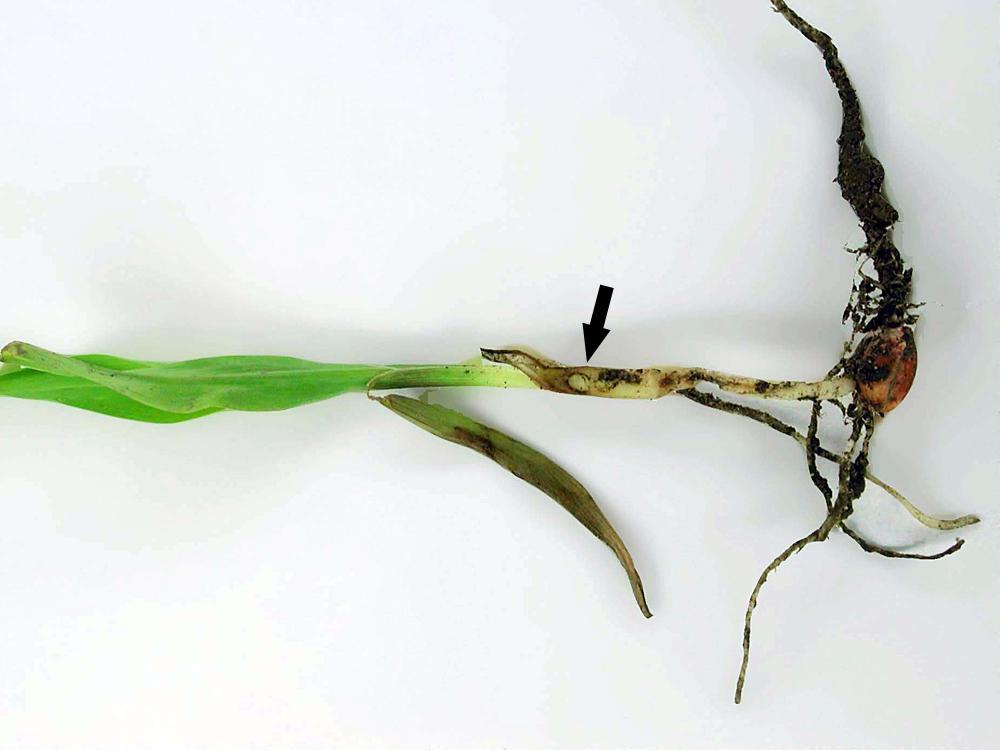 Description: Jeune plant de maïs présentant des dommages causés par les vers fil-de-fer du genre Agriotes : les vers fil-de-fer s'alimentent des parties souterraines des plants de maïs. Des trous et des galeries sont donc parfois observables au niveau du collet.