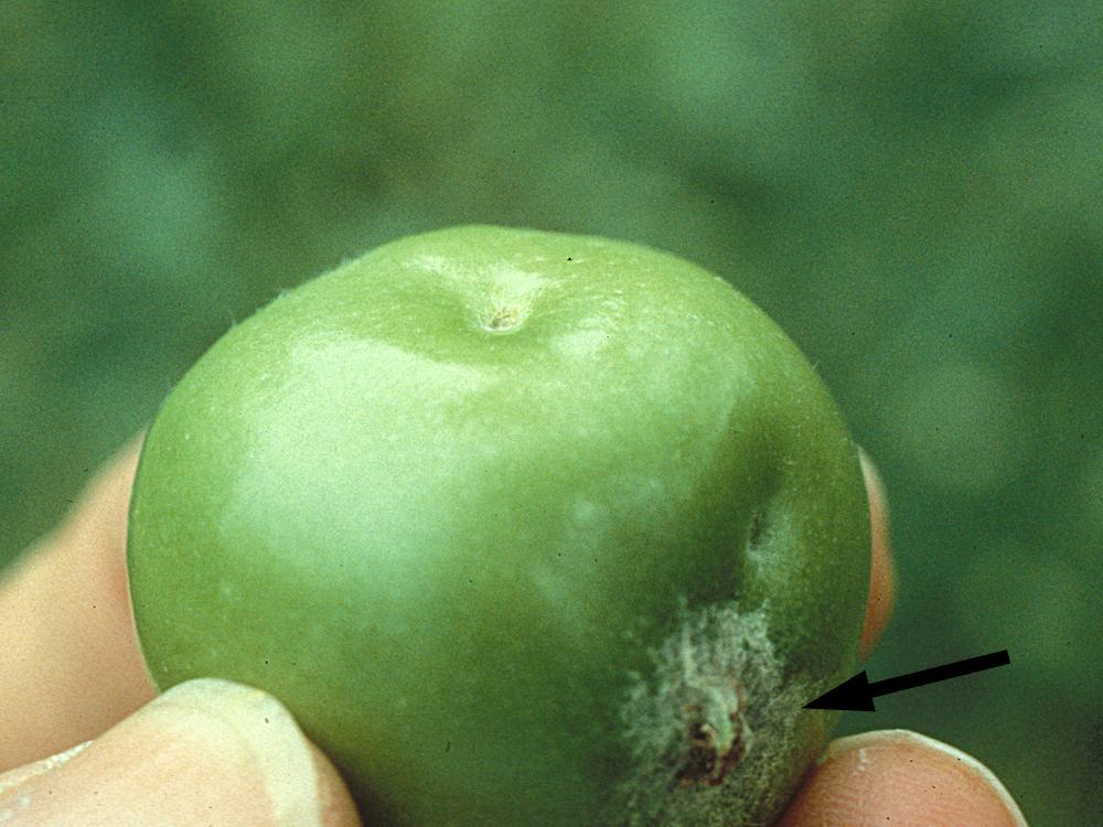 Pomme présentant des dommages causés par la punaise terne : Lygus lineolaris pique les pommes et y injectent une enzyme entraînant la nécrose des tissus. Les piqûres sur les fruits provoquent la formation d'une dépression en forme d'entonnoir accompagné occasionnellement de cicatrices liégeuses.