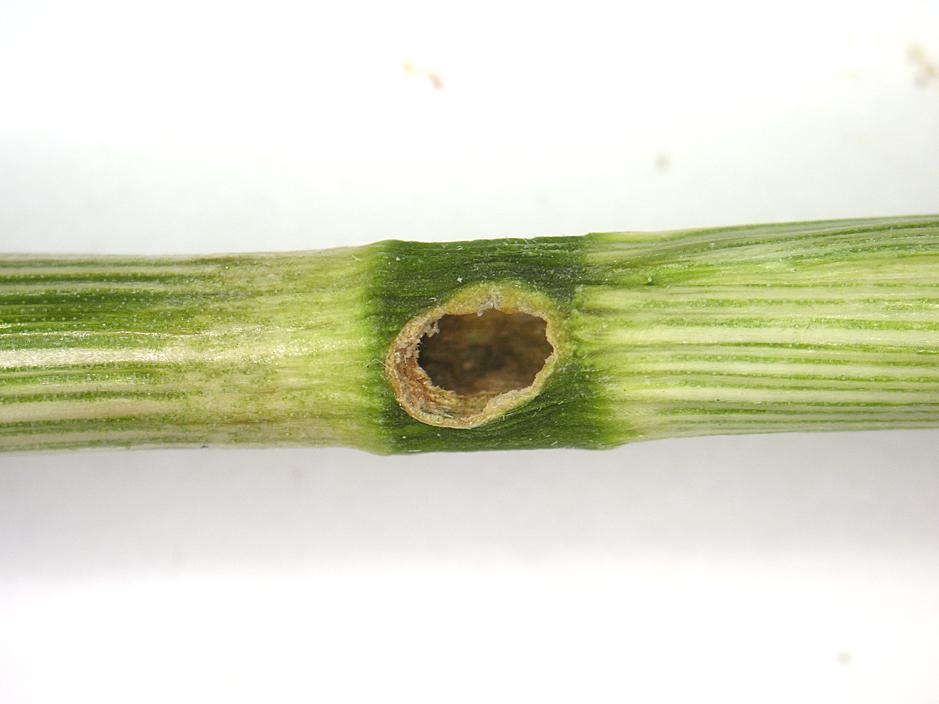 Dommage de la pyrale du maïs sur une tige de blé : cette espèce est un ravageur important dans le maïs et compte plus de 200 plantes-hôtes dont le blé. La larve creuse des galeries dans les tiges pour hiberner. Sur cette photo, on observe le trou d'entrée de la larve.
