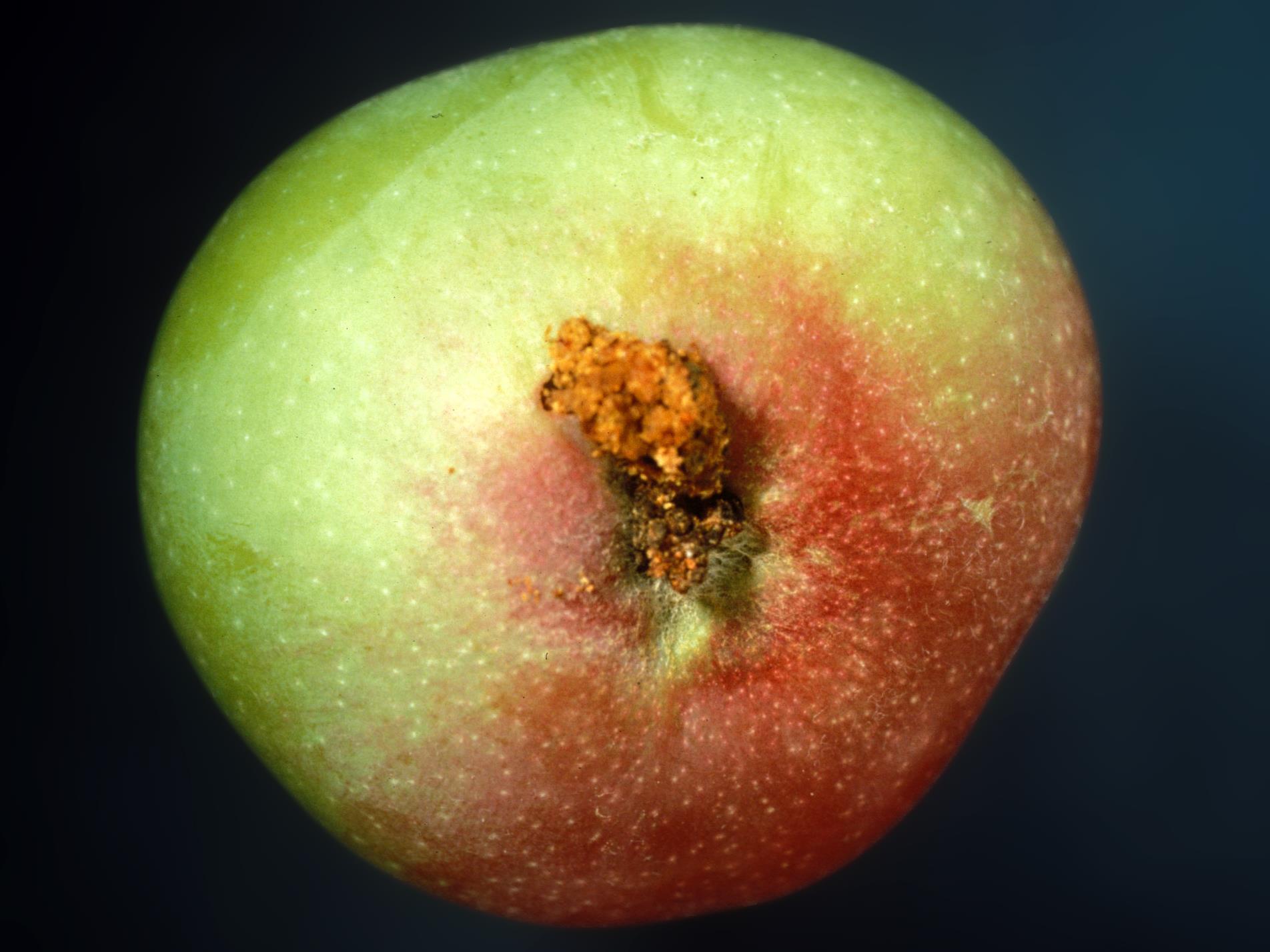 Description: Amas d'excréments de carpocapse de la pomme : la larve de Cydia pomonella creuse de larges galeries atteignant le cœur des pommes. De grandes quantités d'excréments brun-rougeâtre sont présentes à l'intérieur de la galerie ainsi qu'au point d'entrée dans le fruit.