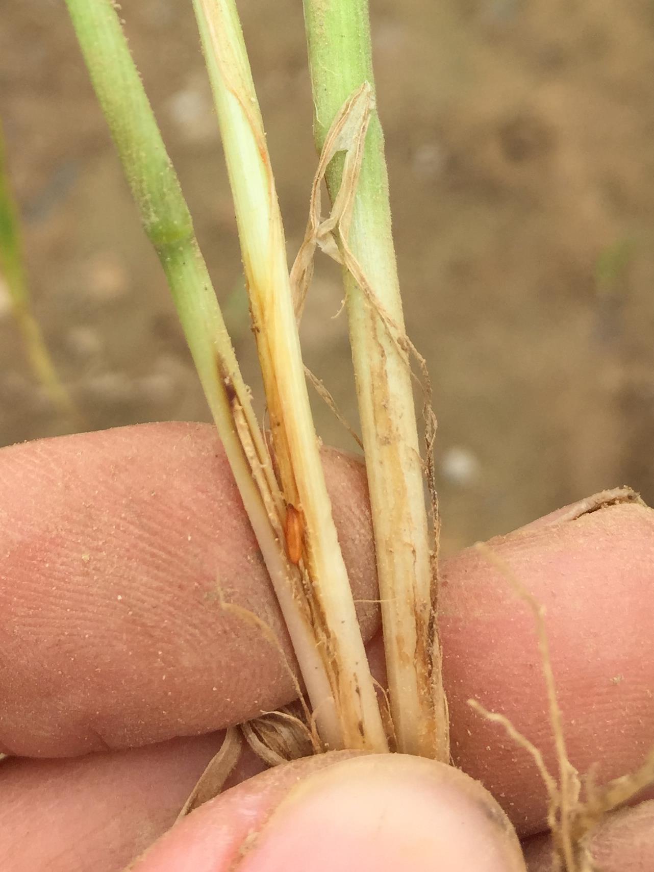 Description: Dommages causés par le développement de la larve d'Oscinella pusilla sur une tige de blé de printemps. On observe le fendillement longitudinal à la base de la tige ainsi que la présence de la pupe d'O. pusilla. Les tiges attaquées se dessèchent et ne sont pas en mesure de produire des épis.