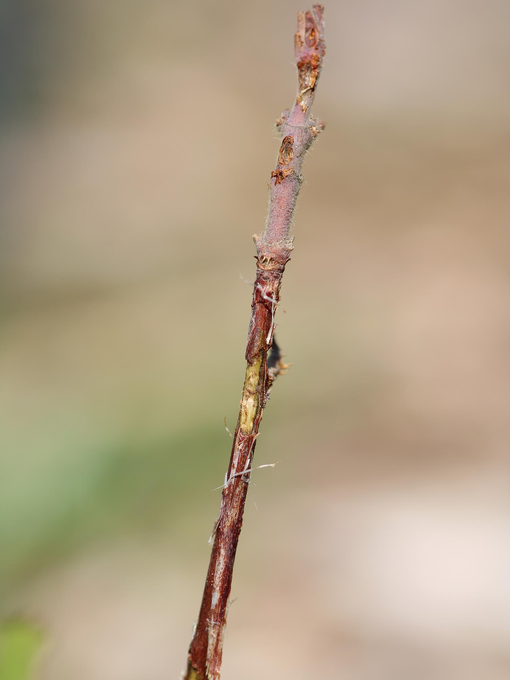 Description: Tige d'un jeune plant de camérisier qui a été complètement défolié. Lorsque tout le feuillage est consommé, les criquets s'attaquent parfois à l'écorce des jeunes tiges.