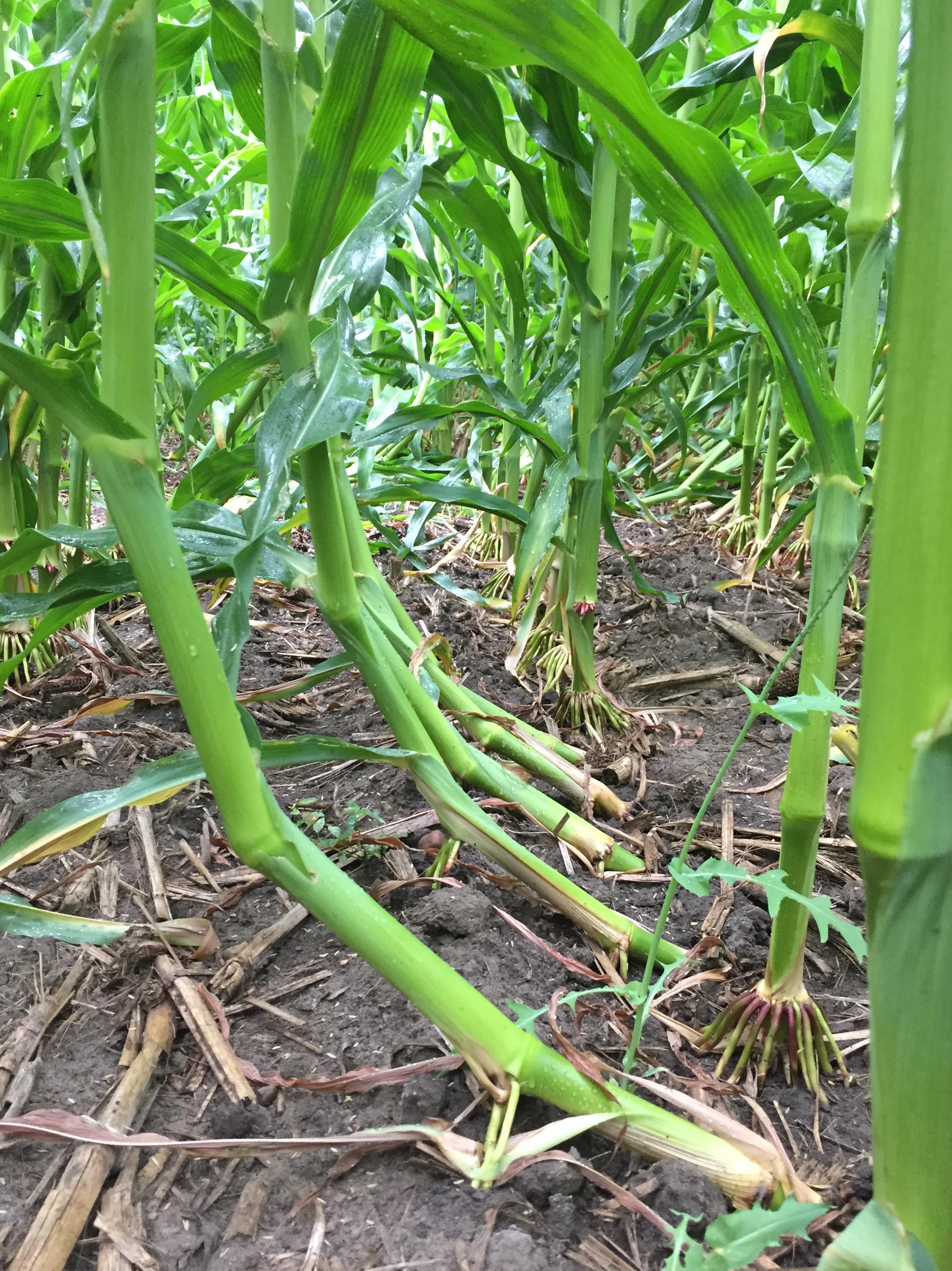 Description: Des plants de maïs avec la tige recourbée en forme de col de cygne, symptôme résultant des dommages causés par des chrysomèles des racines : les larves se nourrissent presque exclusivement de racines de maïs. Les jeunes larves grignotent les radicelles alors que les larves plus âgées creusent des galeries dans les racines d'ancrages. Les plants endommagés sont alors susceptibles de pencher ou de verser. Certains plants prennent alors la forme d'un col de cygne lorsqu'ils se courbent vers le haut dans un effort pour se redresser. Les larves transmettent les Fusarium des racines.