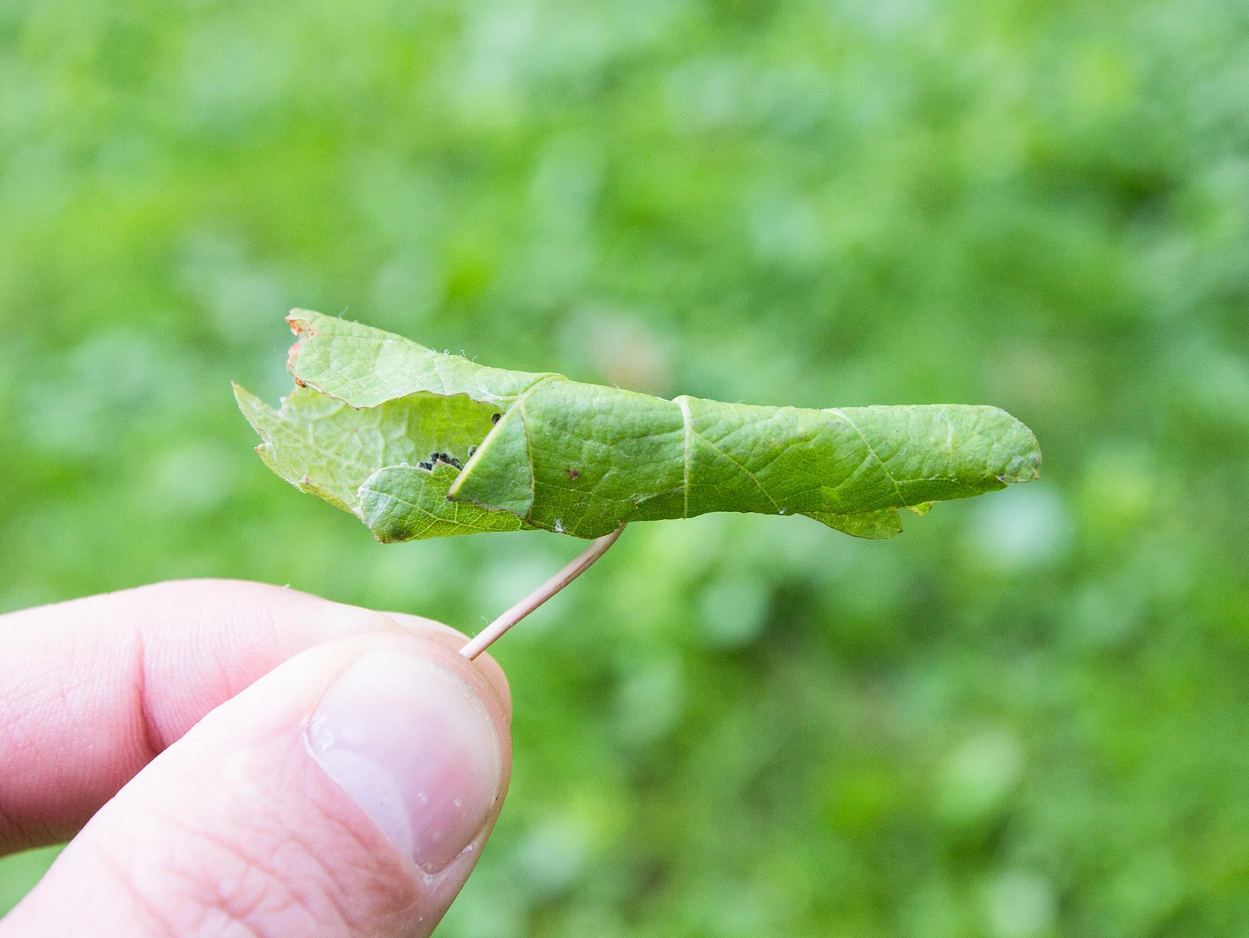 Description: La larve de la plieuse de la vigne enroule les feuilles de vigne à l'aide de soie afin de se protéger des prédateurs et des parasites qui l'attaquent.