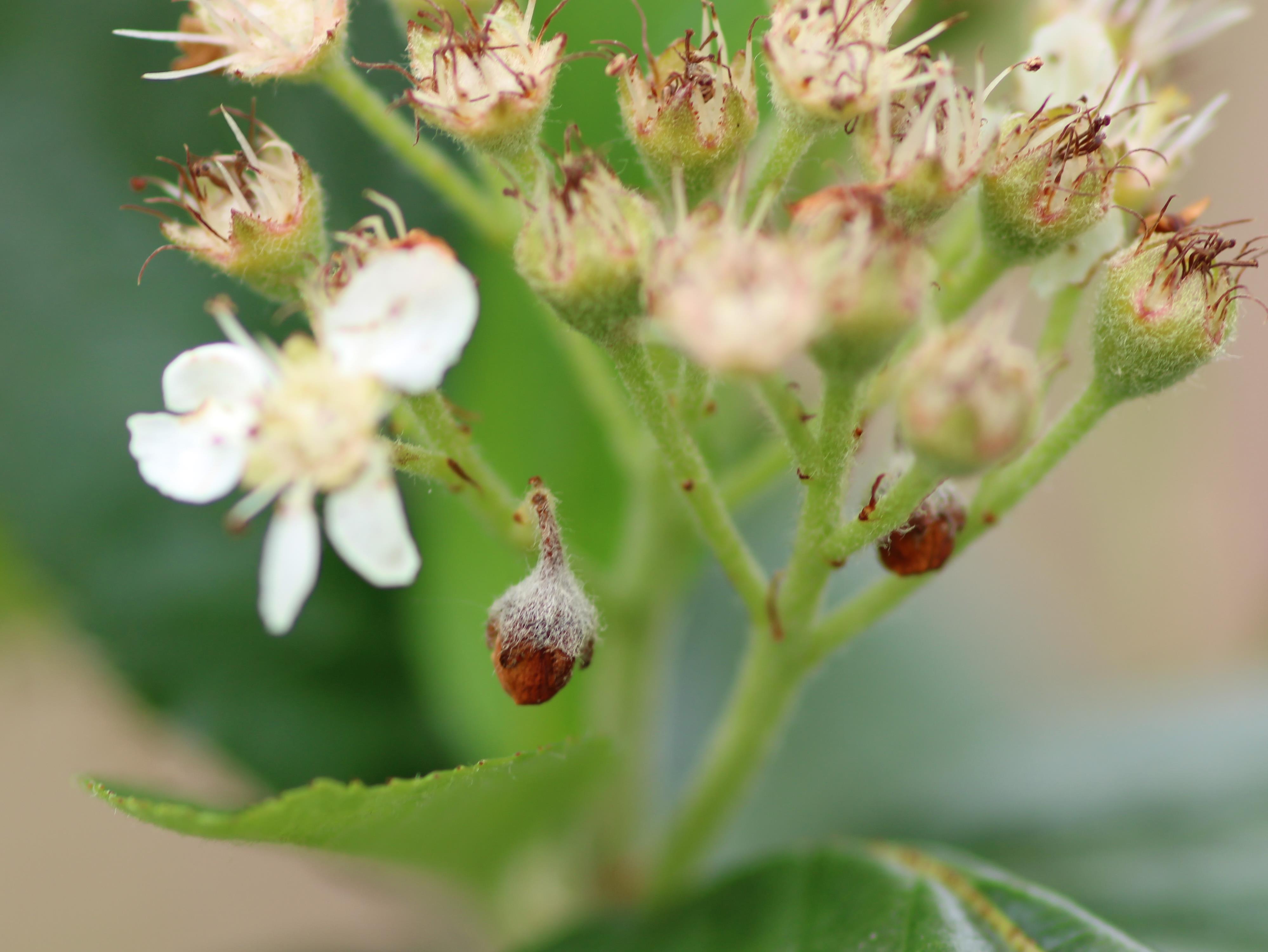 Description: Boutons floraux desséchés à la suite de la nutrition de punaises ternes. La piqûre de nutrition de la punaise terne sur un bouton floral provoque parfois l’apparition d’une goutte de sève appelée exsudat. Les piqûres de punaises ternes adultes entraînent l’avortement et le dessèchement des boutons floraux et donc une baisse de production fruitière.