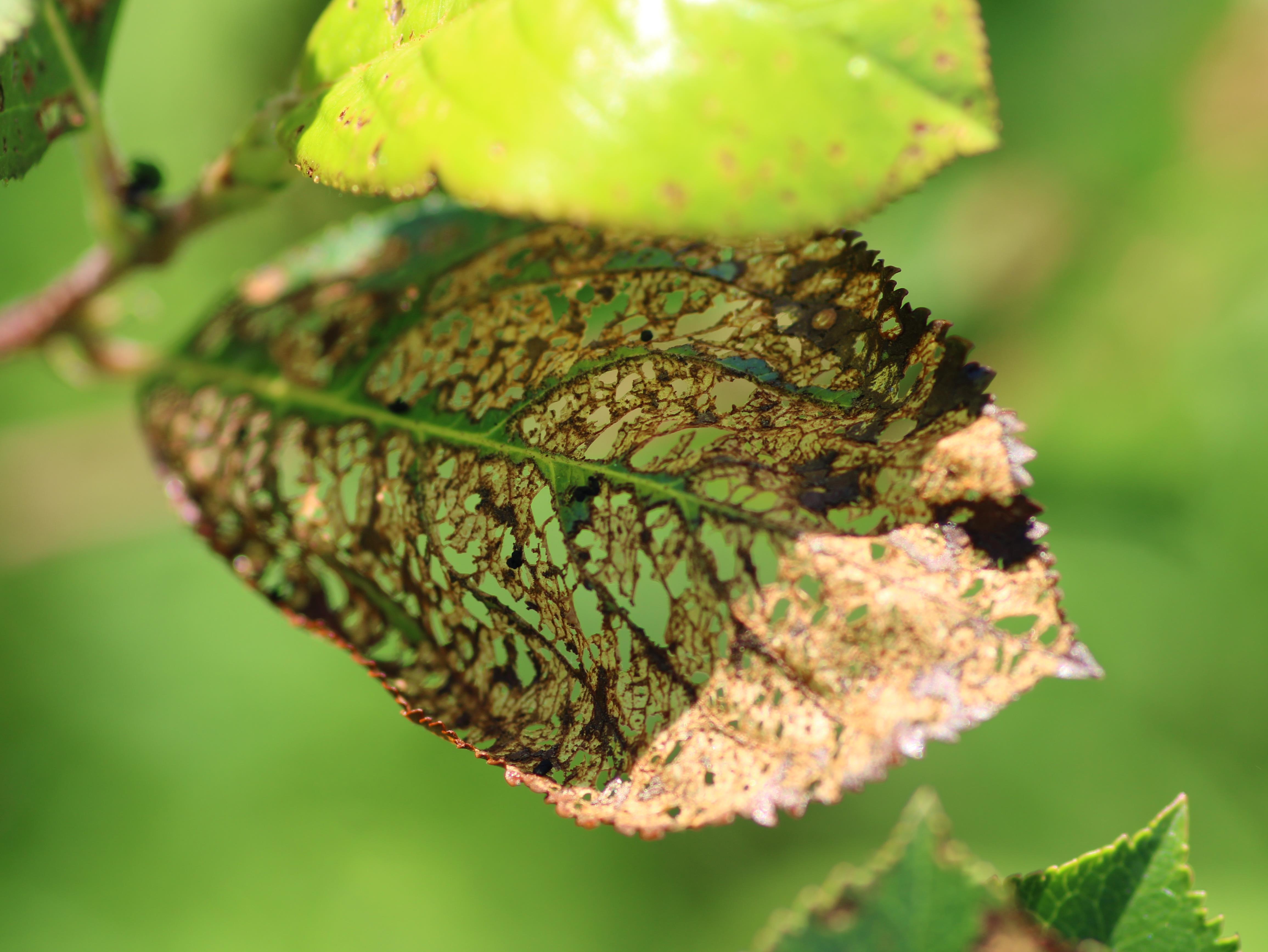 : Dommages typiques d’une feuille d’aronia squelettisée à la suite du passage de scarabées japonais adultes.