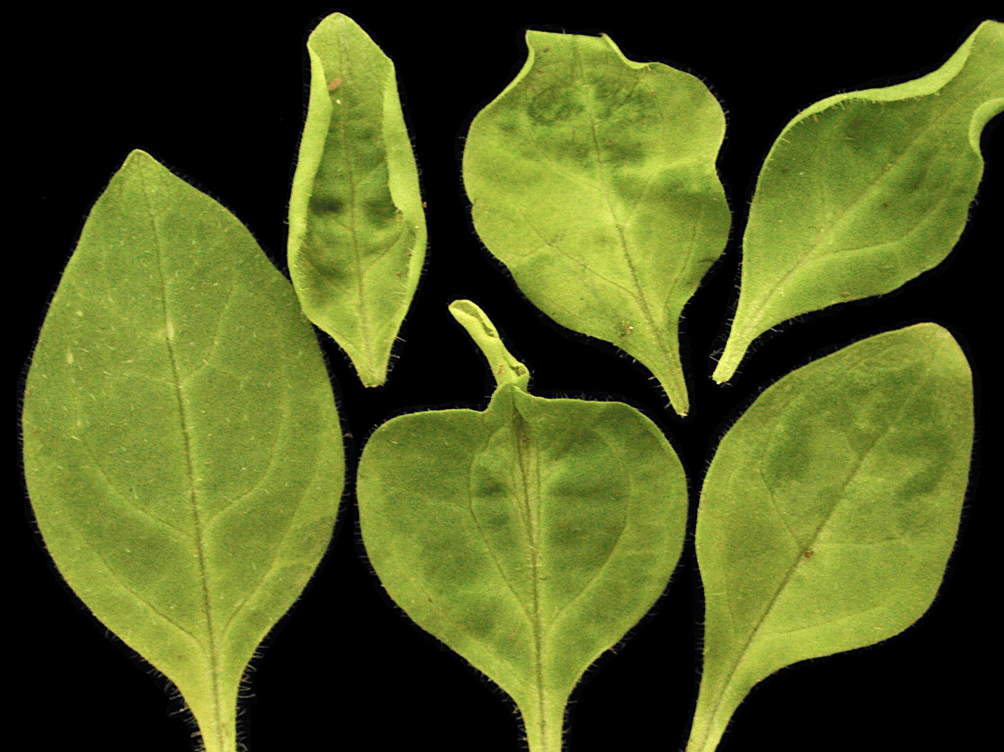 Légende: Comparaison entre une feuille de pétunia saine et des feuilles affectées