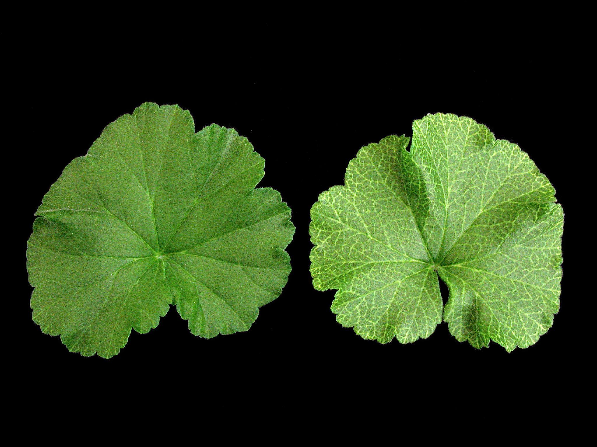 Description: Comparaison entre une feuille de géranium saine et affectée. La feuille affectée montre un jaunissement ou un blanchiment important des nervures principales et secondaires. Le symptôme prend la forme d’un réseau de nervures claires. Tous les autres organes de la plante sont sans symptôme. Seulement 1 % des plants sont affectés. Un cas similaire a été traité au Laboratoire de diagnostic en phytoprotection du MAPAQ et l’échantillon avait été envoyé au Laboratoire de diagnostic de Guelph pour la détection de virus en microscopie électronique. Des particules virales avaient été détectées dans les feuilles aux nervures jaunes. Il pourrait s'agir du virus de la jaunisse réticulée des nervures du pélargonium (PVCV).