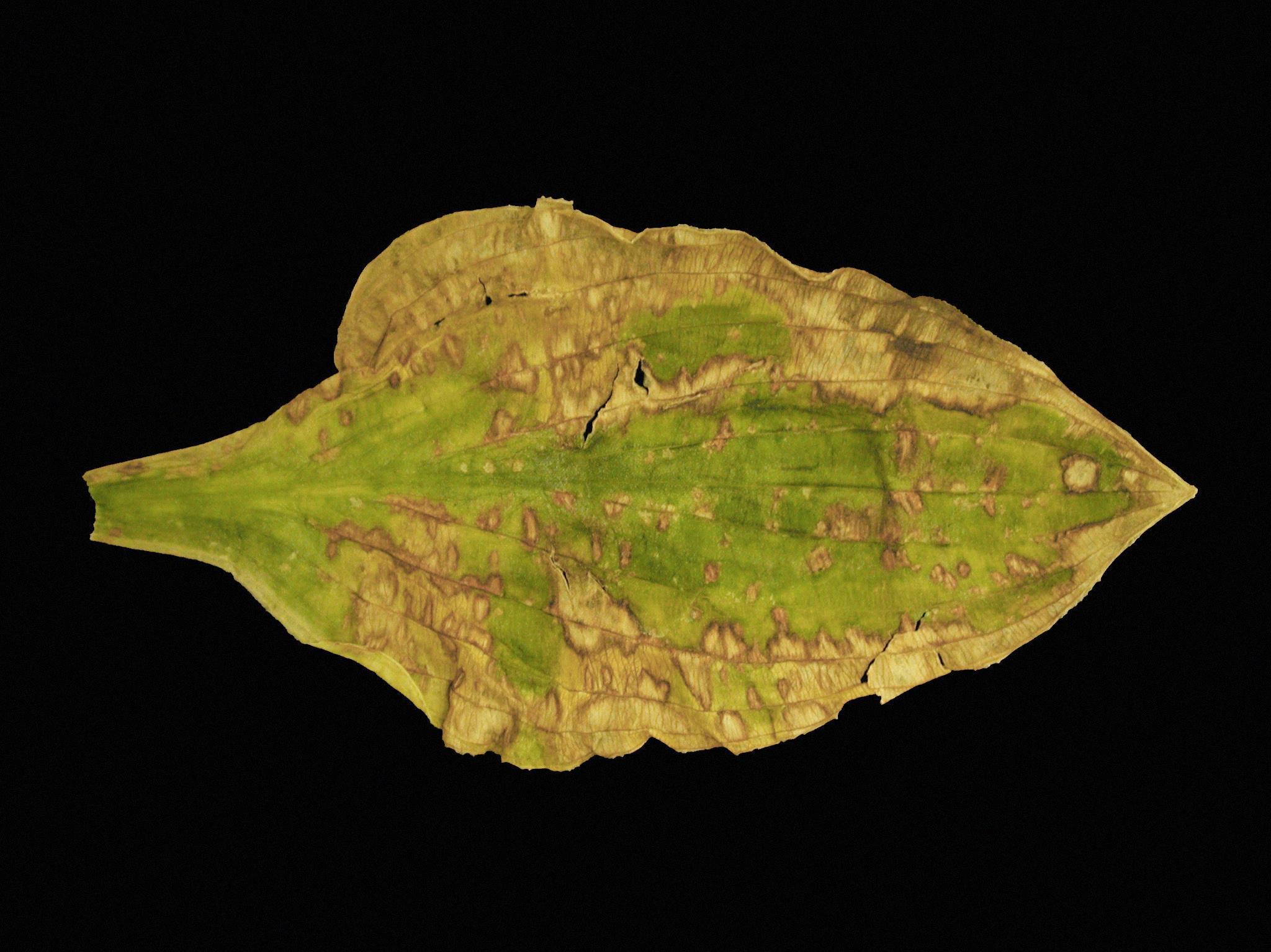 Description: Une feuille d’un hosta (cv 'Golden Tiara') présente une mosaïque constituée de zones irrégulières vert pâle et vert foncé. La feuille présente également des taches circulaires brunes à rougeâtres avec un centre blanchâtre, d’une apparence sèche et ne présentant aucun halo jaune. Le diamètre des taches varie entre 1 et 2 mm. De plus, d’importantes brûlures rectilignes affectent la marge de la feuille et progressent sur le limbe sur une largeur de 1,0 cm. Toutes les feuilles du plant présentent ces symptômes. Les tests de laboratoire ont révélé la présence du virus X du hosta (HVX).