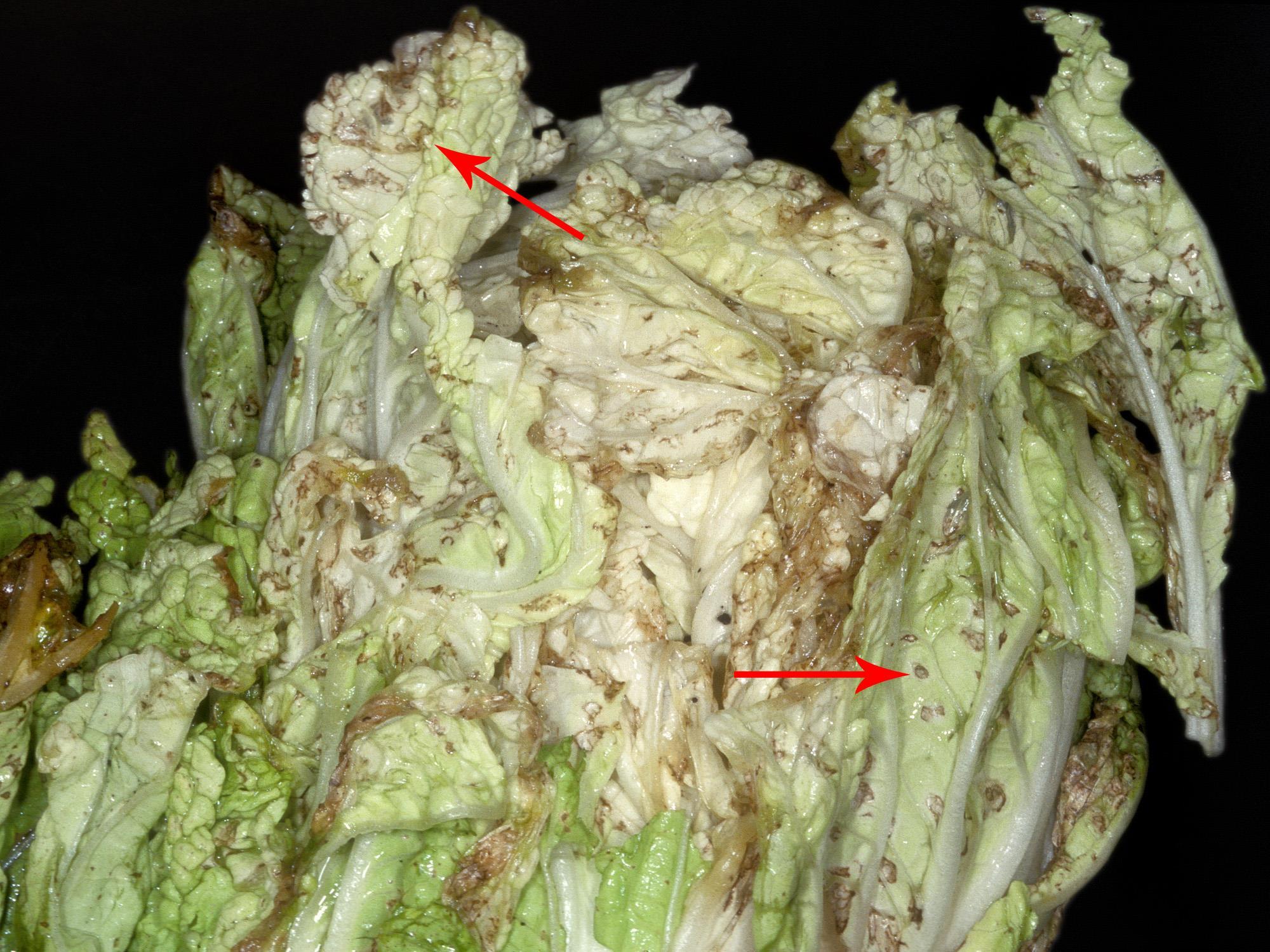 Légende: Taches et pourriture sur feuilles de chou chinois