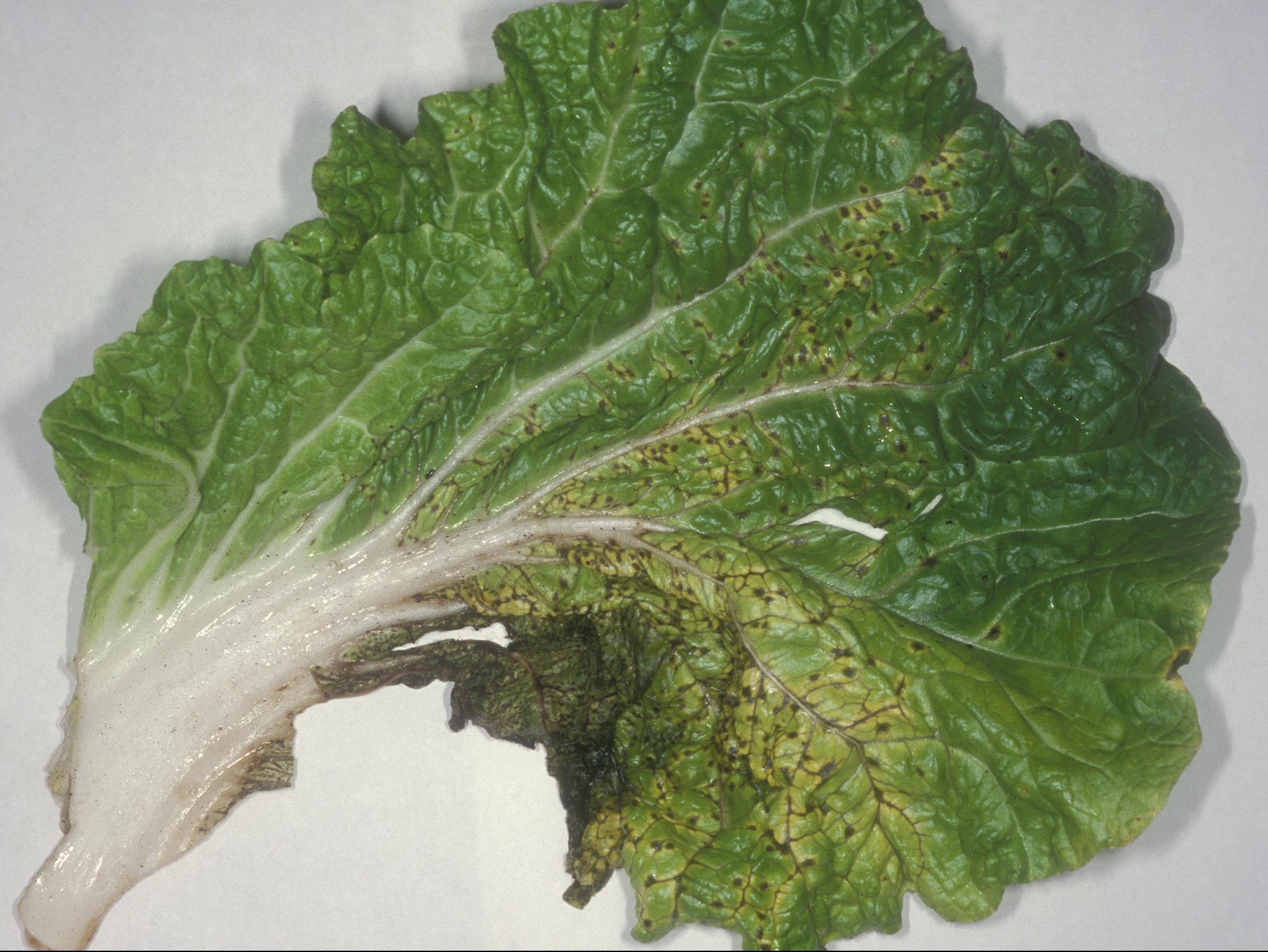 Description: Sur une feuille de chou chinois provenant d’un champ, présence de très petites taches grisâtres à noires et d’un jaunissement diffus localisés entre ou près des nervures. La feuille est également bosselée. Les tests de laboratoire ont révélé la présence d’un Potyvirus.