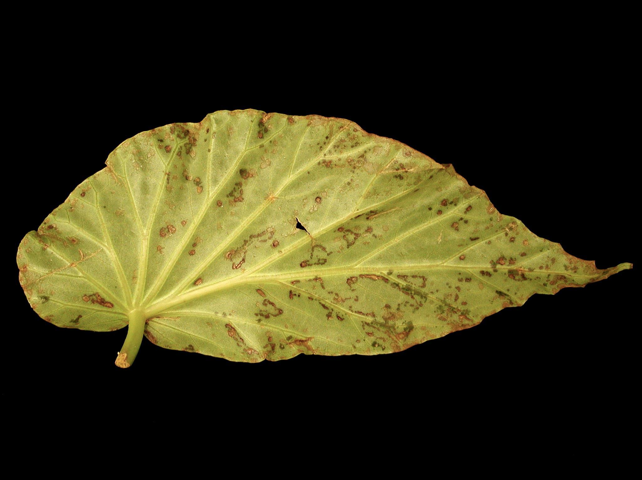 Description: À la face inférieure d’une feuille de bégonia dichroa cultivé en serre, présence de taches avec un large halo brun foncé, d’aspect liégeux. Les taches longent régulièrement les nervures ou sont situées entre celles-ci. Chaque tache à la face inférieure se trouve vis-à-vis une tache à la face supérieure. Les tests de laboratoire ont révélé la présence d’un virus appartenant au groupe des Potyvirus.