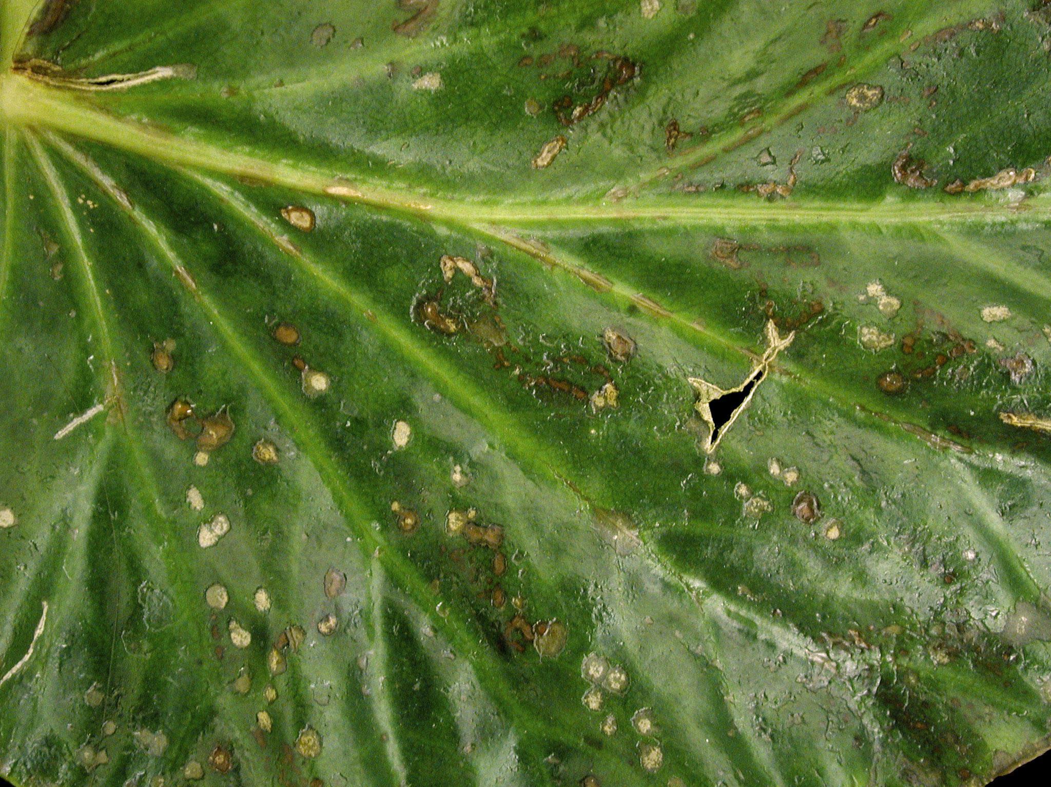Légende: Taches beiges à brunes sur feuille de bégonia
