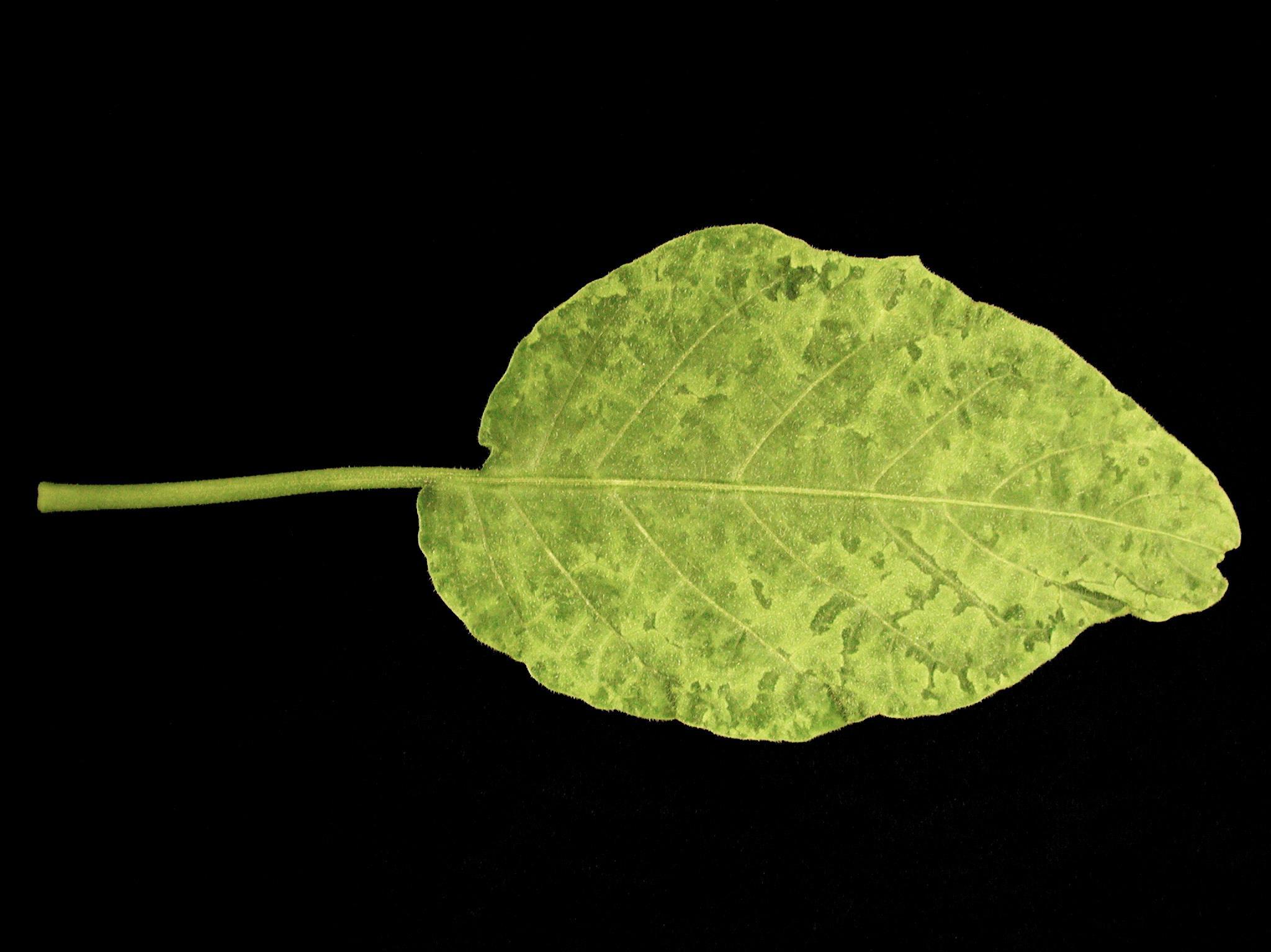 Description: Face supérieure d’une feuille de brugmansia en arbre (cv 'Knightii'). Présence de sévères mosaïques vert pâle à vert foncé, distribuées au hasard sur le limbe. La marge des feuilles est également déformée. Les tests de laboratoire ont révélé la présence d’un virus appartenant au groupe des Potyvirus. La conseillère agricole mentionne que tous les plants de ce cultivar sont affectés.
