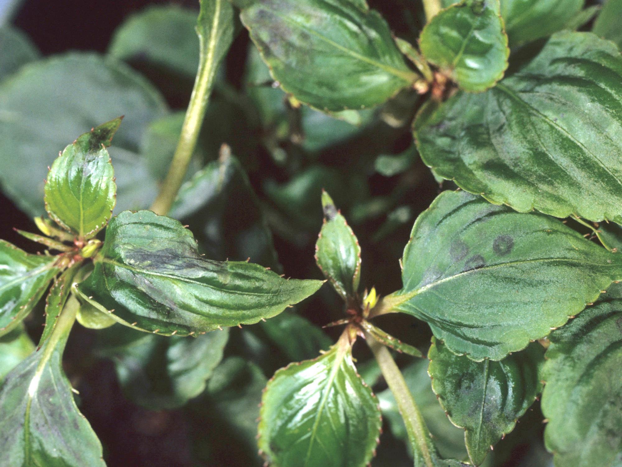 Description: Les feuilles d’impatientes montrent de petites taches circulaires noires ou un noircissement diffus sur le limbe. La marge et l’apex sont déformés. Les tests de laboratoire ont révélé la présence du virus de la tache nécrotique de l'impatiente (INSV).