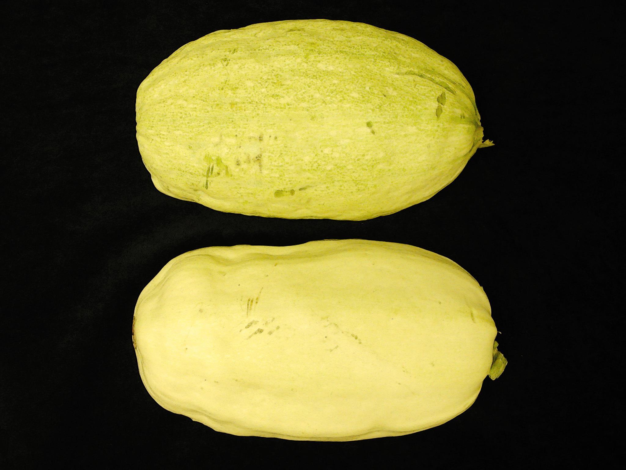 Description: Sur des courges spaghetti, présence d’un bossellement sur toute la surface de l’épiderme des fruits. Le fruit du haut montre également un fin réseau réticulé vert à la surface de l’épiderme. La chair est intacte (non visible ici). Les tests de laboratoire ont révélé la présence d’un complexe viral constitué du virus de la mosaïque du concombre (CMV) et d’un virus appartenant au groupe des Potyvirus. La conseillère agricole mentionne que les symptômes sont distribués de manière éparse au champ et que 2 % des plants sont touchés.