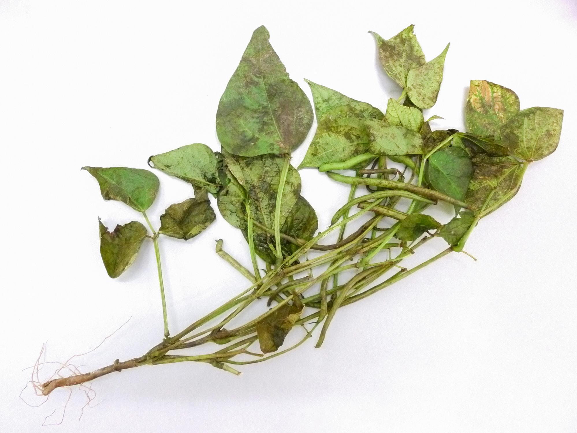 Description: Les jeunes feuilles d’un plant de haricot vert (cv 'Ferrari') montrent une mosaïque jaune-vert et des déformations. Les gousses présentaient des zones brun rougeâtre réparties sur toute leur surface (non visible ici). Les tests de laboratoire ont révélé une forte présence du virus de la mosaïque du concombre (CMV) et une trace du virus de la mosaïque de la luzerne (AMV).